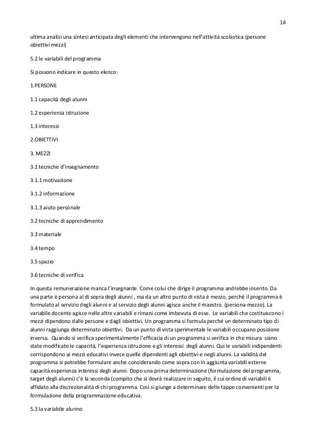 14. 14. 14 ultima analisi una sintesi anticipata degli elementi che intervengono nell’attività scolastica (persone obiettivi mezzi) 5.2 le variabili del programma Si possono indicare in questo elenco: 1.PERSONE 1.1 capacità degli alunni 1.2 esperienza istruzione 1.3 interessi 2.OBIETTIVI 3. MEZZI 3.1 tecniche d’insegnamento 3.1.1 motivazione 3.1.2 informazione 3.1.3 aiuto personale 3.2 tecniche di apprendimento 3.3 materiale 3.4 tempo 3.5 spazio 3.6 tecniche di verifica In questa remunerazione manca l’insegnante. Come colui che dirige il programma andrebbe inserito. Da una parte è persona al di sopra degli alunni , ma da un altro punto di vista è mezzo, perché il programma è formulato al servizio degli alunni e al servizio degli alunni agisce anche il maestro. (persona-mezzo). La variabile docente agisce nelle altre variabili e rimani come imbevuta di esse. Le variabili che costituiscono i mezzi dipendono dalle persone e dagli obiettivi. Un programma si formula perché un determinato tipo di alunni raggiunga determinato obiettivi. Da un punto di vista sperimentale le variabili occupano posizione inversa. Quando si verifica sperimentalmente l’efficacia di un programma si verifica in che misura siano state modificate le capacità, l’esperienza istruzione e gli interessi degli alunni. Qui le variabili indipendenti corrispondono ai mezzi educativi invece quelle dipendenti agli obiettivi e negli alunni. La validità del programma si potrebbe formulare anche considerando come sopra con in aggiunta variabili esterne capacità esperienza interessi degli alunni. Dopo una prima determinazione (formulazione del programma, target degli alunni) c’è la seconda (compito che si dovrà realizzare in seguito, il cui ordine di variabili è affidato alla discrezionalità di chi programma. Così si giunge a determinare delle tappe convenienti per la formulazione della programmazione educativa. 5.3 la variabile alunno