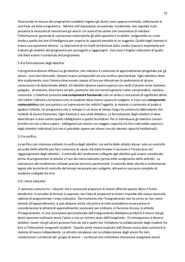 15. 15. 15 Osservando le stesure dei programmi cosiddetti regolari gli alunni sono appena nominati, solitamente in una frase ad inizio programma. Mentre nell’educazione occasionale, incidentale, non regolata è più presente la necessità di menzionare gli alunni. Un scala d’istruzione che consentisse di valutare l’informazione generale le conoscenze sistematiche gli abiti operativi e le abilità svolgerebbe un ruolo simile a quello dei test d’intelligenza per scoprire la capacità mentale di un soggetto. Quella degli interessi è invece una questione diversa. La distinzione di tre livelli di interesse (alto, medio, basso) è importante per indicare gli obiettivi del programma per perseguirli e raggiungerli. Essi sono il miglior indicatore di quello che deve essere il contenuto del programma. 5.4 la formulazione degli obiettivi Il programma diviene efficace se gli obiettivi, che indicano il contenuto di apprendimento progettato per gli alunni, sono ben formulati. Devono essere sottoponibili ad una verifica sperimentale. Ogni obiettivo deve dire esattamente cosa l’alunno deve essere capace di fare per dimostrare la padronanza di alcune conoscenze o di determinate abilità. Gli obiettivi devono essere espressi con verbi d’azione come risolvere, spiegare, enumerare, descrivere ed altri, piuttosto che con termini generici come comprendere, valutare, conoscere. L’obiettivo presenta una componente funzionale cioè un verbo o una parola di significato attivo che indichi l’attività o la funzione che lo studente deve essere capace di svolgere; vi è poi una componente contenutistica cioè una parola o un’espressione che indichi l’oggetto, la materia o contenuto al quale si applica l’attività. Un programma che si sviluppi in un lasso di tempo lungo ha contenuto abbondante che richiede di essere frazionato. Ogni frazione è una unità didattica. La formulazione degli obiettivi si deve diversificare in due settori:quello obbligatorio e quello facoltativo. Poi si individuano gli obiettivi comuni (minimi ciò che si deve sapere - obbligatori per alunni con maggior capacità ciò che si dovrebbe sapere) e degli obiettivi individuali (ciò che si potrebbe sapere per alunni con più elevate capacità intellettuali). 5.5 la verifica La verifica non interessa soltanto la verifica degli obiettivi, ma anche delle attività stesse: solo un controllo accurato delle attività può farci conoscere le cause che determinano il successo o l’insuccesso nel raggiungimento degli obiettivi. Il controllo del rendimento collegato agli obiettivi può essere considerato prima di programmare le attività e l’uso dei mezzi educativi (prima dello svolgimento delle attività). La valutazione del rendimento richiede precise tecniche sperimentali. Il controllo delle attività è strettamente legato alle tecniche di controllo del tempo necessario per svolgerle, attraverso una serie completa di scadenze collegate fra loro. 5.6 i mezzi educativi È opinione comune tra i docenti che è necessario preparare le lezioni affinchè queste diano il frutto desiderato. Il concetto di lezione è superato; ma l’idea di preparare le lezioni risponde alla stessa necessità radicale di programmare i mezzi educativi. Dal momento che l’insegnamento non ha senso se non come stimolo all’apprendimento, si può dedurre anche che prima di tutto dovrebbero essere prese in considerazione le attività di apprendimento necessarie per ordinare, in funzione di esse, le attività d’insegnamento. In una concezione personalizzata dell’insegnamento dobbiamo preferire il lavoro che gli alunni possono realizzare senza l’aiuto o con un minimo aiuto dell’insegnante. Di conseguenza si devono stabilire i lavori che gli alunni possono fare da soli e quelli che richiedono la collaborazione degli studenti fra loro o l’interazione insegnanti studenti. Quanto potrà essere acquisito dall’alunno senza aiuto costituirà la materia di lavoro indipendente. Le attività complesse con la collaborazione degli alunni fra loro costituiranno i contenuti dei gruppi di lavoro . i contenuti che richiedono interazione insegnanti alunni