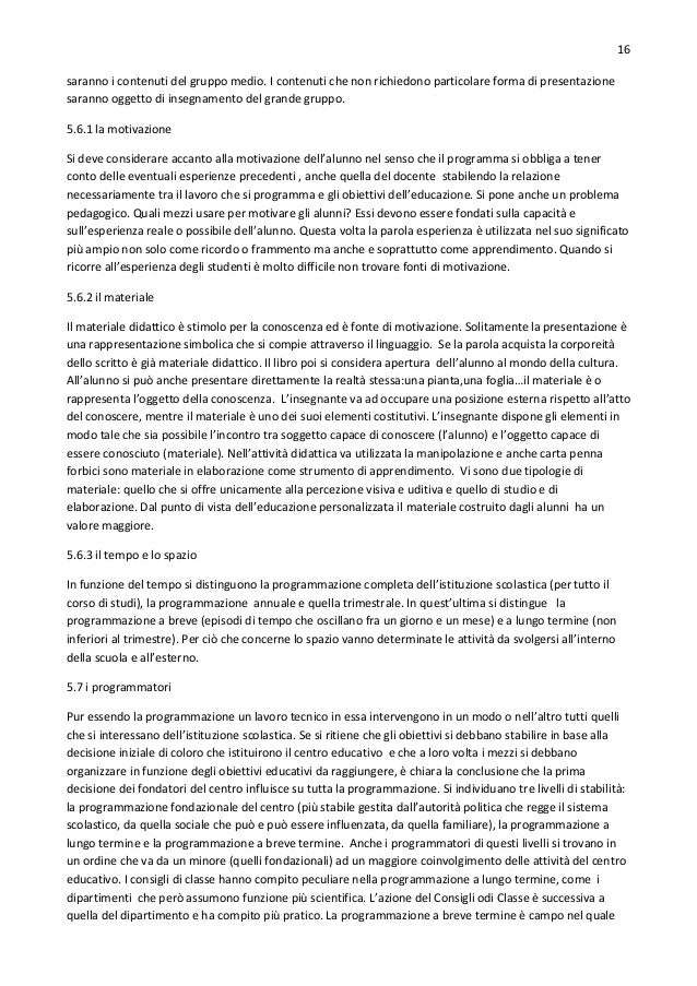 16. 16. 16 saranno i contenuti del gruppo medio. I contenuti che non richiedono particolare forma di presentazione saranno oggetto di insegnamento del grande gruppo. 5.6.1 la motivazione Si deve considerare accanto alla motivazione dell’alunno nel senso che il programma si obbliga a tener conto delle eventuali esperienze precedenti , anche quella del docente stabilendo la relazione necessariamente tra il lavoro che si programma e gli obiettivi dell’educazione. Si pone anche un problema pedagogico. Quali mezzi usare per motivare gli alunni? Essi devono essere fondati sulla capacità e sull’esperienza reale o possibile dell’alunno. Questa volta la parola esperienza è utilizzata nel suo significato più ampio non solo come ricordo o frammento ma anche e soprattutto come apprendimento. Quando si ricorre all’esperienza degli studenti è molto difficile non trovare fonti di motivazione. 5.6.2 il materiale Il materiale didattico è stimolo per la conoscenza ed è fonte di motivazione. Solitamente la presentazione è una rappresentazione simbolica che si compie attraverso il linguaggio. Se la parola acquista la corporeità dello scritto è già materiale didattico. Il libro poi si considera apertura dell’alunno al mondo della cultura. All’alunno si può anche presentare direttamente la realtà stessa:una pianta,una foglia…il materiale è o rappresenta l’oggetto della conoscenza. L’insegnante va ad occupare una posizione esterna rispetto all’atto del conoscere, mentre il materiale è uno dei suoi elementi costitutivi. L’insegnante dispone gli elementi in modo tale che sia possibile l’incontro tra soggetto capace di conoscere (l’alunno) e l’oggetto capace di essere conosciuto (materiale). Nell’attività didattica va utilizzata la manipolazione e anche carta penna forbici sono materiale in elaborazione come strumento di apprendimento. Vi sono due tipologie di materiale: quello che si offre unicamente alla percezione visiva e uditiva e quello di studio e di elaborazione. Dal punto di vista dell’educazione personalizzata il materiale costruito dagli alunni ha un valore maggiore. 5.6.3 il tempo e lo spazio In funzione del tempo si distinguono la programmazione completa dell’istituzione scolastica (per tutto il corso di studi), la programmazione annuale e quella trimestrale. In quest’ultima si distingue la programmazione a breve (episodi di tempo che oscillano fra un giorno e un mese) e a lungo termine (non inferiori al trimestre). Per ciò che concerne lo spazio vanno determinate le attività da svolgersi all’interno della scuola e all’esterno. 5.7 i programmatori Pur essendo la programmazione un lavoro tecnico in essa intervengono in un modo o nell’altro tutti quelli che si interessano dell’istituzione scolastica. Se si ritiene che gli obiettivi si debbano stabilire in base alla decisione iniziale di coloro che istituirono il centro educativo e che a loro volta i mezzi si debbano organizzare in funzione degli obiettivi educativi da raggiungere, è chiara la conclusione che la prima decisione dei fondatori del centro influisce su tutta la programmazione. Si individuano tre livelli di stabilità: la programmazione fondazionale del centro (più stabile gestita dall’autorità politica che regge il sistema scolastico, da quella sociale che può e può essere influenzata, da quella familiare), la programmazione a lungo termine e la programmazione a breve termine. Anche i programmatori di questi livelli si trovano in un ordine che va da un minore (quelli fondazionali) ad un maggiore coinvolgimento delle attività del centro educativo. I consigli di classe hanno compito peculiare nella programmazione a lungo termine, come i dipartimenti che però assumono funzione più scientifica. L’azione del Consigli odi Classe è successiva a quella del dipartimento e ha compito più pratico. La programmazione a breve termine è campo nel quale