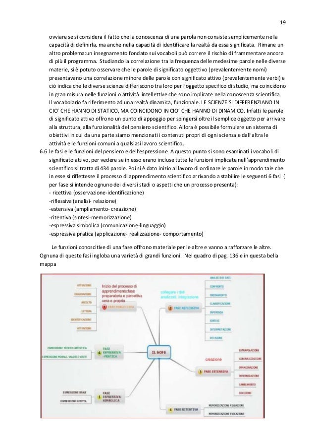 19. 19. 19 ovviare se si considera il fatto che la conoscenza di una parola non consiste semplicemente nella capacità di definirla, ma anche nella capacità di identificare la realtà da essa significata. Rimane un altro problema:un insegnamento fondato sui vocaboli può correre il rischio di frammentare ancora di più il programma. Studiando la correlazione tra la frequenza delle medesime parole nelle diverse materie, si è potuto osservare che le parole di significato oggettivo (prevalentemente nomi) presentavano una correlazione minore delle parole con significato attivo (prevalentemente verbi) e ciò indica che le diverse scienze differiscono tra loro per l’oggetto specifico di studio, ma coincidono in gran misura nelle funzioni o attività intellettive che sono implicate nella conoscenza scientifica. Il vocabolario fa riferimento ad una realtà dinamica, funzionale. LE SCIENZE SI DIFFERENZIANO IN CIO’ CHE HANNO DI STATICO, MA COINCIDONO IN CIO’ CHE HANNO DI DINAMICO. Infatti le parole di significato attivo offrono un punto di appoggio per spingersi oltre il semplice oggetto per arrivare alla struttura, alla funzionalità del pensiero scientifico. Allora è possibile formulare un sistema di obiettivi in cui da una parte siamo menzionati i contenuti propri di ogni scienza e dall’altra le attività e le funzioni comuni a qualsiasi lavoro scientifico. 6.6 le fasi e le funzioni del pensiero e dell’espressione A questo punto si sono esaminati i vocaboli di significato attivo, per vedere se in esso erano incluse tutte le funzioni implicate nell’apprendimento scientifico:si tratta di 434 parole. Poi si è dato inizio al lavoro di ordinare le parole in modo tale che in esse si riflettesse il processo di apprendimento scientifico arrivando a stabilire le seguenti 6 fasi ( per fase si intende ognuno dei diversi stadi o aspetti che un processo presenta): - ricettiva (osservazione-identificazione) -riflessiva (analisi- relazione) -estensiva (ampliamento- creazione) -ritentiva (sintesi-memorizzazione) -espressiva simbolica (comunicazione-linguaggio) -espressiva pratica (applicazione- realizzazione- comportamento) Le funzioni conoscitive di una fase offrono materiale per le altre e vanno a rafforzare le altre. Ognuna di queste fasi ingloba una varietà di grandi funzioni. Nel quadro di pag. 136 e in questa bella mappa