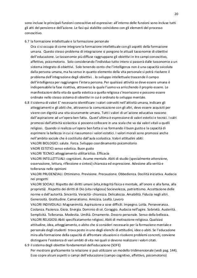 20. 20. 20 sono incluse le principali funzioni conoscitive ed espressive: all’interno delle funzioni sono incluse tutti gli atti del pensiero e dell’azione. Le fasi qui stabilite coincidono con gli elementi del processo conoscitivo. 6.7 la formazione intellettuale e la formazione personale Ora ci si occupa di come integrare la formazione intellettuale con gli aspetti della formazione umana. Questo stesso problema di integrazione si pongono le attuali tassonomie di obiettivi dell’educazione. Le tassonomie più diffuse raggruppano gli obiettivi in tre campi:conoscitivo, affettivo, psicomotorio. Solo considerando l’individuo tutto intero si passerà dalle tassonomie a un sistema integrato di obiettivi. Solo tenendo conto che l’intelligenza non è una capacità svicolata dalla persona umana, ma ha senso in quanto elemento della vita personale si potrà risolvere il problema dell’integrazione degli obiettivi. . lo sviluppo intellettuale trascende il campo dell’intelligenza per raggiungere l’intera persona. Per qualsiasi attività se deve essere umana è indispensabile la fase ricettiva, attraverso la quale l’uomo va arricchendo il proprio essere. Le manifestazioni della vita da quella estetica a quella religiosa s’inseriscono e possono essere ordinate nello stesso sistema di obiettivi in cui è ordinato lo sviluppo mentale. 6.8 il sistema di valori E’ necessario identificare i valori coinvolti nell’attività umana, indicare gli atteggiamenti e gli abiti che, attraverso la comunicazione con gli altri, devo essere acquisiti per vivere con dignità una vita sicuramente umana. Tutti i valori di un’azione educativa nascono dall’aspirazione ad un’opera ben fatta. Quest’ultima è espressione di valori estetici e tecnici. I valri promossi dall’attività scolastica si possono collocare in una scala che va dai valori vitali a quelli religiosi. Quando si realizza un’opera ben fatta si va formando il buon gusto e la capacità di esprimere la bellezza in cui si riassumono i valori estetici. I valori morali sono promossi anche nell’ambito sociale che è costituito dall’aula scolastica. Valori attitudini abiti: VALORI BIOLOGICI: salute. Forza. Sviluppo coordinamento psicomotorio VAORI ESTETICI:senso estetico. Buon gusto VALORI TECNICI:atteggiamento utilitaristico. Efficacia VALORI INTELLETTUALI: cognizioni. Acume mentale. Abiti di studio (specialmente attenzione, osservazione, lettura, riflessione e sintesi) chiarezza ed espressione. Adesione alla verità e tolleranza nelle opinioni VALORI PRUDENZIALI. Ottimismo. Previsione. Precauzione. Obbedienza. Docilità iniziativa. Audacia nei progetti VALORI SOCIALI: Rispetto dei diritti umani (vita,integrità fisica e mentale, all’onore e alla fama, alla proprietà) . Rispetto dei diritti di Dio (vita religiosa) Socievolezza, patriottismo. Accettazione delle norme e dell’autorità. Sincerità. Veracità- chiarezza. Delicatezza. Amabilità. Fiducia negli altri. Generosità. Gratitudine. Cameratismo. Amicizia. Lealtà. Lavoro VALORI INDIVIDUALI: Magnanimità. Aspirazione a cose difficili. Impegno. Lotta. Perseveranza. Costanza. Pazienza. Gioia. Energia. Dominio di sé. Coraggio. Audacia nell’agire. Sobrietà. Austerità. Semplicità. Tolleranza. Modestia. Umiltà. Ornamento. Decoro personale. Senso della bellezza. VALORI RELIGIOSI:Abiti specificatamente religiosi. Abiti di motivazione religiosa. Qualsiasi attitudine, idea, atteggiamento, o abito che si consideri necessario per la formazione mentale e personale degli studenti trova posto in uno degli elenchi di attitudini, idee o abiti. Se l’educazione mira alla formazione della capacità di affrontare situazioni o risolvere problemi concreti, conviene distinguere l’esistenza di vari ambiti di vita nei quali si devono realizzare i valori citati. 6.9 il sistema degli obiettivi fondamentali dell’educazione (SOFE) Per mostrare graficamente la relazione si può utilizzare un modello tridimensionale (vedi pag. 144). Esso copre alcuni aspetti o campi dell’educazione (campo cognitivo, affettivo, psicomotorio)