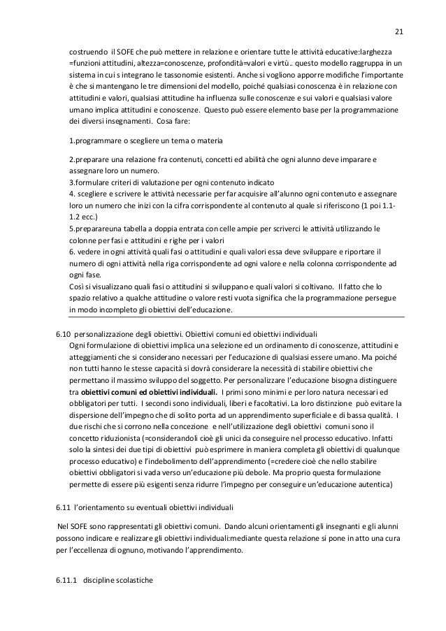 21. 21. 21 costruendo il SOFE che può mettere in relazione e orientare tutte le attività educative:larghezza =funzioni attitudini, altezza=conoscenze, profondità=valori e virtù.. questo modello raggruppa in un sistema in cui s integrano le tassonomie esistenti. Anche si vogliono apporre modifiche l’importante è che si mantengano le tre dimensioni del modello, poiché qualsiasi conoscenza è in relazione con attitudini e valori, qualsiasi attitudine ha influenza sulle conoscenze e sui valori e qualsiasi valore umano implica attitudini e conoscenze. Questo può essere elemento base per la programmazione dei diversi insegnamenti. Cosa fare: 1.programmare o scegliere un tema o materia 2.preparare una relazione fra contenuti, concetti ed abilità che ogni alunno deve imparare e assegnare loro un numero. 3.formulare criteri di valutazione per ogni contenuto indicato 4. scegliere e scrivere le attività necessarie per far acquisire all’alunno ogni contenuto e assegnare loro un numero che inizi con la cifra corrispondente al contenuto al quale si riferiscono (1 poi 1.11.2 ecc.) 5.preparareuna tabella a doppia entrata con celle ampie per scriverci le attività utilizzando le colonne per fasi e attitudini e righe per i valori 6. vedere in ogni attività quali fasi o attitudini e quali valori essa deve sviluppare e riportare il numero di ogni attività nella riga corrispondente ad ogni valore e nella colonna corrispondente ad ogni fase. Così si visualizzano quali fasi o attitudini si sviluppano e quali valori si coltivano. Il fatto che lo spazio relativo a qualche attitudine o valore resti vuota significa che la programmazione persegue in modo incompleto gli obiettivi dell’educazione. 6.10 personalizzazione degli obiettivi. Obiettivi comuni ed obiettivi individuali Ogni formulazione di obiettivi implica una selezione ed un ordinamento di conoscenze, attitudini e atteggiamenti che si considerano necessari per l’educazione di qualsiasi essere umano. Ma poiché non tutti hanno le stesse capacità si dovrà considerare la necessità di stabilire obiettivi che permettano il massimo sviluppo del soggetto. Per personalizzare l’educazione bisogna distinguere tra obiettivi comuni ed obiettivi individuali. I primi sono minimi e per loro natura necessari ed obbligatori per tutti. I secondi sono individuali, liberi e facoltativi. La loro distinzione può evitare la dispersione dell’impegno che di solito porta ad un apprendimento superficiale e di bassa qualità. I due rischi che si corrono nella concezione e nell’utilizzazione degli obiettivi comuni sono il concetto riduzionista (=considerandoli cioè gli unici da conseguire nel processo educativo. Infatti solo la sintesi dei due tipi di obiettivi può esprimere in maniera completa gli obiettivi di qualunque processo educativo) e l’indebolimento dell’apprendimento (=credere cioè che nello stabilire obiettivi obbligatori si vada verso un’educazione più debole. Ma proprio questa formulazione permette di essere più esigenti senza ridurre l’impegno per conseguire un’educazione autentica) 6.11 l’orientamento su eventuali obiettivi individuali Nel SOFE sono rappresentati gli obiettivi comuni. Dando alcuni orientamenti gli insegnanti e gli alunni possono indicare e realizzare gli obiettivi individuali:mediante questa relazione si pone in atto una cura per l’eccellenza di ognuno, motivando l’apprendimento. 6.11.1 discipline scolastiche