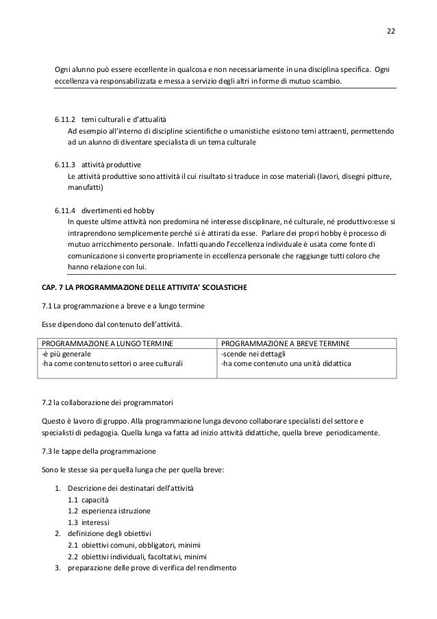 22. 22. 22 Ogni alunno può essere eccellente in qualcosa e non necessariamente in una disciplina specifica. Ogni eccellenza va responsabilizzata e messa a servizio degli altri in forme di mutuo scambio. 6.11.2 temi culturali e d’attualità Ad esempio all’interno di discipline scientifiche o umanistiche esistono temi attraenti, permettendo ad un alunno di diventare specialista di un tema culturale 6.11.3 attività produttive Le attività produttive sono attività il cui risultato si traduce in cose materiali (lavori, disegni pitture, manufatti) 6.11.4 divertimenti ed hobby In queste ultime attività non predomina né interesse disciplinare, né culturale, né produttivo:esse si intraprendono semplicemente perché si è attirati da esse. Parlare dei propri hobby è processo di mutuo arricchimento personale. Infatti quando l’eccellenza individuale è usata come fonte di comunicazione si converte propriamente in eccellenza personale che raggiunge tutti coloro che hanno relazione con lui. CAP. 7 LA PROGRAMMAZIONE DELLE ATTIVITA’ SCOLASTICHE 7.1 La programmazione a breve e a lungo termine Esse dipendono dal contenuto dell’attività. PROGRAMMAZIONE A LUNGO TERMINE -è più generale -ha come contenuto settori o aree culturali PROGRAMMAZIONE A BREVE TERMINE -scende nei dettagli -ha come contenuto una unità didattica 7.2 la collaborazione dei programmatori Questo è lavoro di gruppo. Alla programmazione lunga devono collaborare specialisti del settore e specialisti di pedagogia. Quella lunga va fatta ad inizio attività didattiche, quella breve periodicamente. 7.3 le tappe della programmazione Sono le stesse sia per quella lunga che per quella breve: 1. Descrizione dei destinatari dell’attività 1.1 capacità 1.2 esperienza istruzione 1.3 interessi 2. definizione degli obiettivi 2.1 obiettivi comuni, obbligatori, minimi 2.2 obiettivi individuali, facoltativi, minimi 3. preparazione delle prove di verifica del rendimento