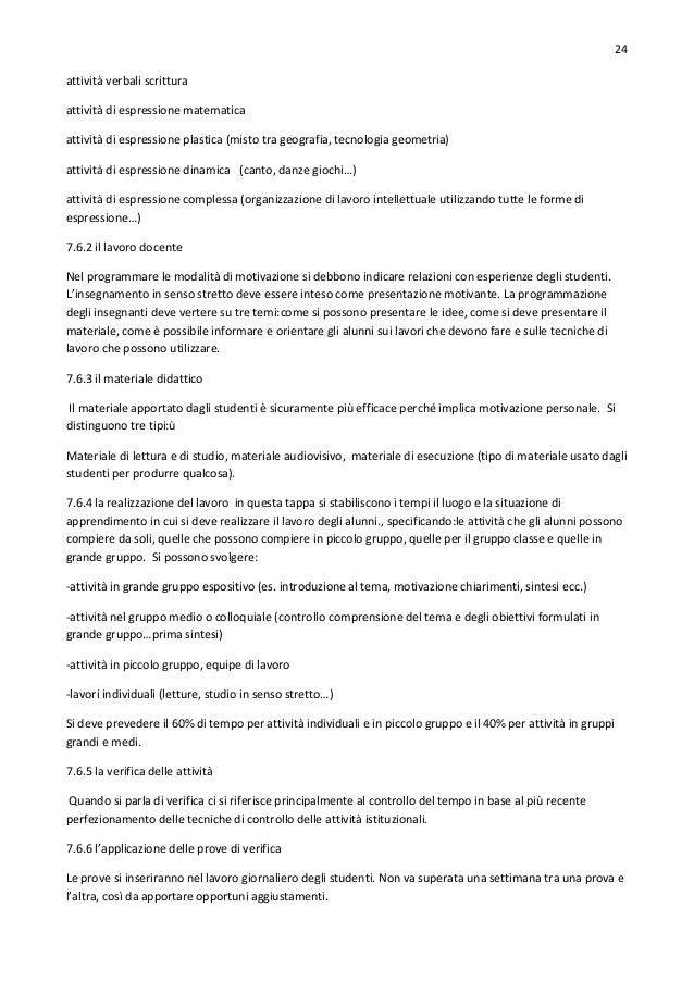 23. 23. 23 4. i mezzi 4.1 attività e tecniche di apprendimento 4.2 attività docente 4.2.1 motivazione 4.2.2 informazione insegnamento 4.2.3 aiuto personale 4.3 materiali 4.4 realizzazione del lavoro (tempi, luoghi, situazioni di apprendimento) 4.4.1 grande gruppo 4.4.2 gruppo medio 4.4.3 piccolo gruppo 4.4.4 lavoro individuale 4.5 controllo delle attività 4.6 applicazione delle prove di verifica 4.7 recupero e potenziamento 7.4 descrizione dei destinatari dell’attività Bisogna fissare non il tipo astratto di alunno medio, ma i limiti di capacità e di istruzione tra i quali si devono trovare gli alunni che si ritiene possano usufruire efficacemente dell’attività programmata. Se ci si trova in una classe di 12 anni so dovrà formulare un programma di lavoro che possa essere realizzato efficacemente da alunni compresi tra i 9 e i 15 anni di età mentale. Poi si indicherà quali conoscenze gli alunni devono possedere per comprendere i contenuti. 7.5 definizione personalizzata degli obiettivi e preparazione delle prove di verifica Vanno individuati gli obiettivi comuni e gli obiettivi individuali. Questi vengono stabiliti dall’alunno stesso:in quest’ambito occorre distinguere gli obiettivi facoltativi da quelli liberi. All’interno del tema di studio gli alunni hanno la facoltà di scegliere uno o più obiettivi,facoltativi sono questi obiettivi, mentre quelli liberi sono quelli che gli studenti possono scegliere o non scegliere. Un alunno poco dotato impiegherà più tempo ad acquisire quelli comuni e avrà meno tempo per quelli individuali. Tutti gli alunni però dovranno impiegare per raggiungere gli obiettivi comuni, almeno quelli di cui ha bisogno il più dotato. Dunque i più dotati avranno più tempo per dedicarsi agli obiettivi individuali. 7.6 la disposizione dei mezzi La risorsa principale di ogni tipo di educazione è l’attività degli studenti, pertanto il nucleo centrale della programmazione è quello di prevedere le tecniche di apprendimento che gli studenti devono utilizzare. Poi verrà il resto. 7.6.1 attività scolastiche e tecniche di apprendimento Vengono in questo paragrafo specificate le attività che gli alunni possono realizzare in ognuno degli ambiti di espressione (verbale, matematica, plastica, dinamica, complessa). Esse si disitnguino in : attività verbali espressione orale attività verbali ricezione orale ascolto attvità verbali lettura