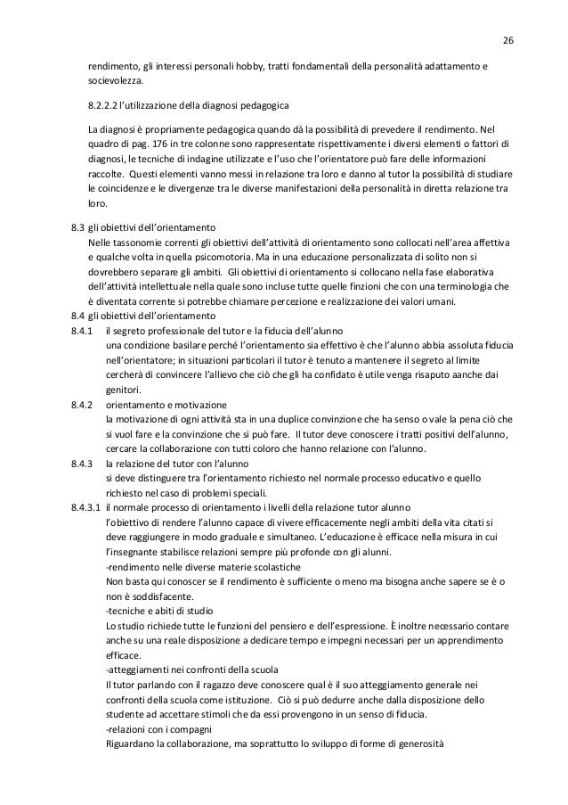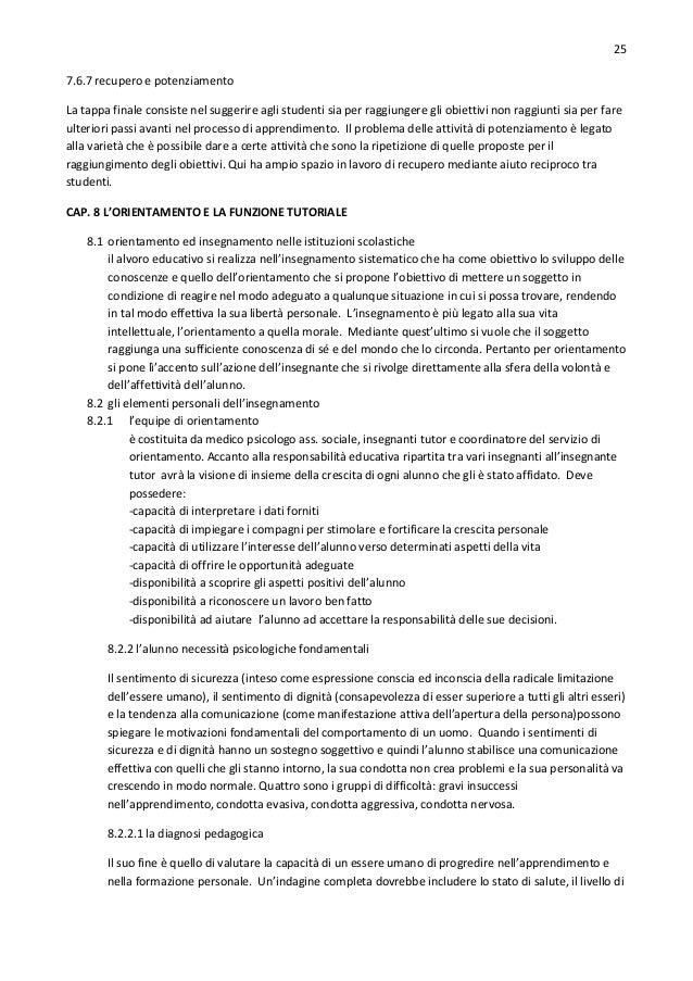 25. 25. 25 7.6.7 recupero e potenziamento La tappa finale consiste nel suggerire agli studenti sia per raggiungere gli obiettivi non raggiunti sia per fare ulteriori passi avanti nel processo di apprendimento. Il problema delle attività di potenziamento è legato alla varietà che è possibile dare a certe attività che sono la ripetizione di quelle proposte per il raggiungimento degli obiettivi. Qui ha ampio spazio in lavoro di recupero mediante aiuto reciproco tra studenti. CAP. 8 L’ORIENTAMENTO E LA FUNZIONE TUTORIALE 8.1 orientamento ed insegnamento nelle istituzioni scolastiche il alvoro educativo si realizza nell’insegnamento sistematico che ha come obiettivo lo sviluppo delle conoscenze e quello dell’orientamento che si propone l’obiettivo di mettere un soggetto in condizione di reagire nel modo adeguato a qualunque situazione in cui si possa trovare, rendendo in tal modo effettiva la sua libertà personale. L’insegnamento è più legato alla sua vita intellettuale, l’orientamento a quella morale. Mediante quest’ultimo si vuole che il soggetto raggiunga una sufficiente conoscenza di sé e del mondo che lo circonda. Pertanto per orientamento si pone lì’accento sull’azione dell’insegnante che si rivolge direttamente alla sfera della volontà e dell’affettività dell’alunno. 8.2 gli elementi personali dell’insegnamento 8.2.1 l’equipe di orientamento è costituita da medico psicologo ass. sociale, insegnanti tutor e coordinatore del servizio di orientamento. Accanto alla responsabilità educativa ripartita tra vari insegnanti all’insegnante tutor avrà la visione di insieme della crescita di ogni alunno che gli è stato affidato. Deve possedere: -capacità di interpretare i dati forniti -capacità di impiegare i compagni per stimolare e fortificare la crescita personale -capacità di utilizzare l’interesse dell’alunno verso determinati aspetti della vita -capacità di offrire le opportunità adeguate -disponibilità a scoprire gli aspetti positivi dell’alunno -disponibilità a riconoscere un lavoro ben fatto -disponibilità ad aiutare l’alunno ad accettare la responsabilità delle sue decisioni. 8.2.2 l’alunno necessità psicologiche fondamentali Il sentimento di sicurezza (inteso come espressione conscia ed inconscia della radicale limitazione dell’essere umano), il sentimento di dignità (consapevolezza di esser superiore a tutti gli altri esseri) e la tendenza alla comunicazione (come manifestazione attiva dell’apertura della persona)possono spiegare le motivazioni fondamentali del comportamento di un uomo. Quando i sentimenti di sicurezza e di dignità hanno un sostegno soggettivo e quindi l’alunno stabilisce una comunicazione effettiva con quelli che gli stanno intorno, la sua condotta non crea problemi e la sua personalità va crescendo in modo normale. Quattro sono i gruppi di difficoltà: gravi insuccessi nell’apprendimento, condotta evasiva, condotta aggressiva, condotta nervosa. 8.2.2.1 la diagnosi pedagogica Il suo fine è quello di valutare la capacità di un essere umano di progredire nell’apprendimento e nella formazione personale. Un’indagine completa dovrebbe includere lo stato di salute, il livello di