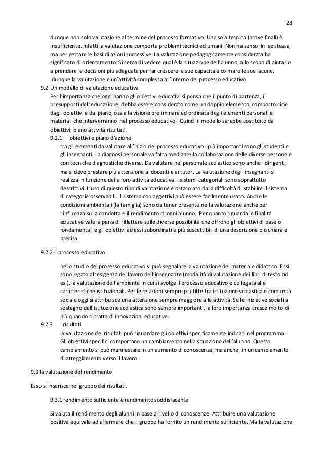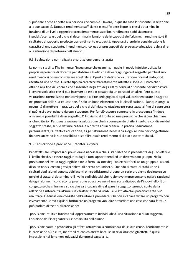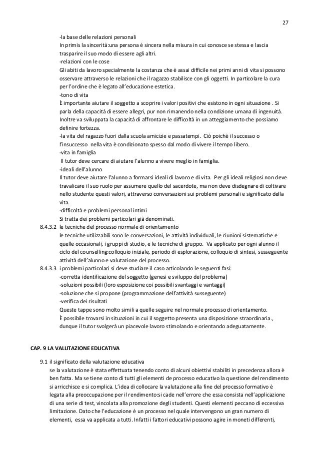 27. 27. 27 -la base delle relazioni personali In primis la sincerità:una persona è sincera nella misura in cui conosce se stessa e lascia trasparire il suo modo di essere agli altri. -relazioni con le cose Gli abiti da lavoro specialmente la costanza che è assai difficile nei primi anni di vita si possono osservare attraverso le relazioni che il ragazzo stabilisce con gli oggetti. In particolare la cura per l’ordine che è legato all’educazione estetica. -tono di vita È importante aiutare il soggetto a scoprire i valori positivi che esistono in ogni situazione . Si parla della capacità di essere allegri, pur non rimanendo nella condizione umana di ingenuità. Inoltre va sviluppata la capacità di affrontare le difficoltà in un atteggiamento che possiamo definire fortezza. -la vita del ragazzo fuori dalla scuola amicizie e passatempi. Ciò poichè il successo o l’insuccesso nella vita è condizionato spesso dal modo di vivere il tempo libero. -vita in famiglia Il tutor deve cercare di aiutare l’alunno a vivere meglio in famiglia. -ideali dell’alunno Il tutor deve aiutare l’alunno a formarsi ideali di lavoro e di vita. Per gli ideali religiosi non deve travalicare il suo ruolo per assumere quello del sacerdote, ma non deve disdegnare di coltivare nello studente questi valori, attraverso conversazioni sui problemi personali e significato della vita. -difficoltà e problemi personal intimi Si tratta dei problemi particolari già denominati. 8.4.3.2 le tecniche del processo normale di orientamento le tecniche utilizzabili sono le conversazioni, le attività individuali, le riunioni sistematiche e quelle occasionali, i gruppi di studio, e le tecniche di gruppo. Va applicato per ogni alunno il ciclo del counselling:colloquio iniziale, periodo di esplorazione, colloquio di sintesi, susseguente attività dell’alunno e valutazione del processo. 8.4.3.3 i problemi particolari si deve studiare il caso articolando le seguenti fasi: -corretta identificazione del soggetto (genesi e sviluppo del problema) -soluzioni possibili (loro esposizione coi possibili svantaggi e vantaggi) -soluzione che si propone (programmazione dell’attività susseguente) -verifica dei risultati Queste tappe sono molto simili a quelle seguire nel normale processo di orientamento. È possibile trovarsi in situazioni in cui il soggetto presenta una disposizione straordinaria., dunque il tutor svolgerà un piacevole lavoro stimolando e orientando adeguatamente. CAP. 9 LA VALUTAZIONE EDUCATIVA 9.1 il significato della valutazione educativa se la valutazione è stata effettuata tenendo conto di alcuni obiettivi stabiliti in precedenza allora è ben fatta. Ma se tiene conto di tutti gli elementi de processo educativo la questione del rendimento si arricchisce e si complica. L’idea di collocare la valutazione alla fine del processo formativo è legata alla preoccupazione per il rendimento:si cade nell’errore che essa consista nell’applicazione di una serie di test, vincolata alla promozione degli studenti. Questi elementi peccano di eccessiva limitazione. Dato che l’educazione è un processo nel quale intervengono un gran numero di elementi, essa va applicata a tutti. Infatti i fattori educativi possono agire in moneti differenti,
