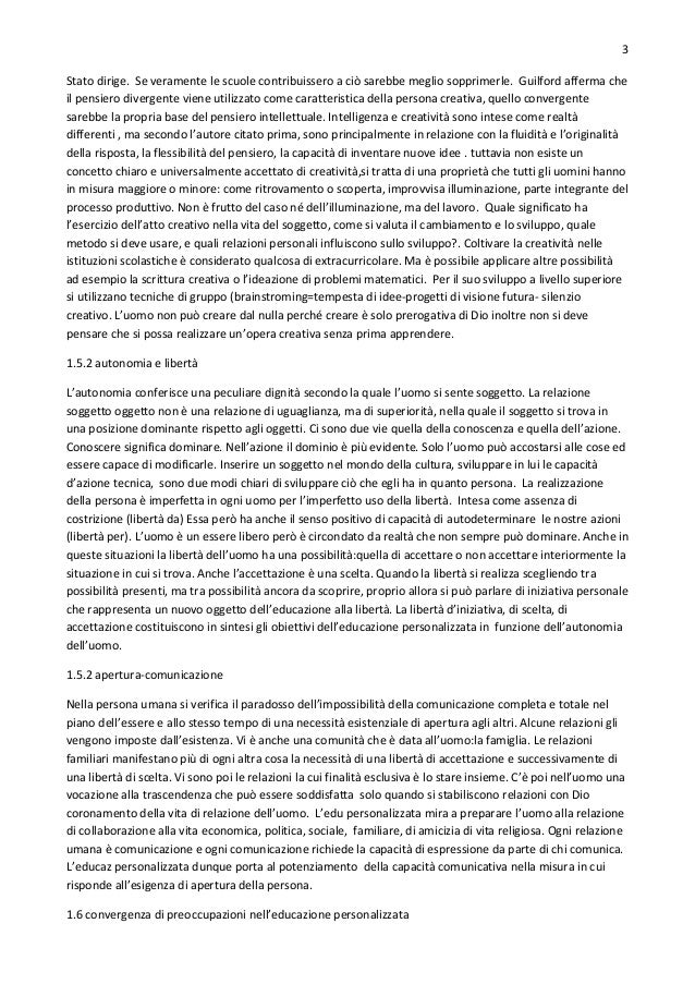 3. 3. 3 Stato dirige. Se veramente le scuole contribuissero a ciò sarebbe meglio sopprimerle. Guilford afferma che il pensiero divergente viene utilizzato come caratteristica della persona creativa, quello convergente sarebbe la propria base del pensiero intellettuale. Intelligenza e creatività sono intese come realtà differenti , ma secondo l’autore citato prima, sono principalmente in relazione con la fluidità e l’originalità della risposta, la flessibilità del pensiero, la capacità di inventare nuove idee . tuttavia non esiste un concetto chiaro e universalmente accettato di creatività,si tratta di una proprietà che tutti gli uomini hanno in misura maggiore o minore: come ritrovamento o scoperta, improvvisa illuminazione, parte integrante del processo produttivo. Non è frutto del caso né dell’illuminazione, ma del lavoro. Quale significato ha l’esercizio dell’atto creativo nella vita del soggetto, come si valuta il cambiamento e lo sviluppo, quale metodo si deve usare, e quali relazioni personali influiscono sullo sviluppo?. Coltivare la creatività nelle istituzioni scolastiche è considerato qualcosa di extracurricolare. Ma è possibile applicare altre possibilità ad esempio la scrittura creativa o l’ideazione di problemi matematici. Per il suo sviluppo a livello superiore si utilizzano tecniche di gruppo (brainstroming=tempesta di idee-progetti di visione futura- silenzio creativo. L’uomo non può creare dal nulla perché creare è solo prerogativa di Dio inoltre non si deve pensare che si possa realizzare un’opera creativa senza prima apprendere. 1.5.2 autonomia e libertà L’autonomia conferisce una peculiare dignità secondo la quale l’uomo si sente soggetto. La relazione soggetto oggetto non è una relazione di uguaglianza, ma di superiorità, nella quale il soggetto si trova in una posizione dominante rispetto agli oggetti. Ci sono due vie quella della conoscenza e quella dell’azione. Conoscere significa dominare. Nell’azione il dominio è più evidente. Solo l’uomo può accostarsi alle cose ed essere capace di modificarle. Inserire un soggetto nel mondo della cultura, sviluppare in lui le capacità d’azione tecnica, sono due modi chiari di sviluppare ciò che egli ha in quanto persona. La realizzazione della persona è imperfetta in ogni uomo per l’imperfetto uso della libertà. Intesa come assenza di costrizione (libertà da) Essa però ha anche il senso positivo di capacità di autodeterminare le nostre azioni (libertà per). L’uomo è un essere libero però è circondato da realtà che non sempre può dominare. Anche in queste situazioni la libertà dell’uomo ha una possibilità:quella di accettare o non accettare interiormente la situazione in cui si trova. Anche l’accettazione è una scelta. Quando la libertà si realizza scegliendo tra possibilità presenti, ma tra possibilità ancora da scoprire, proprio allora si può parlare di iniziativa personale che rappresenta un nuovo oggetto dell’educazione alla libertà. La libertà d’iniziativa, di scelta, di accettazione costituiscono in sintesi gli obiettivi dell’educazione personalizzata in funzione dell’autonomia dell’uomo. 1.5.2 apertura-comunicazione Nella persona umana si verifica il paradosso dell’impossibilità della comunicazione completa e totale nel piano dell’essere e allo stesso tempo di una necessità esistenziale di apertura agli altri. Alcune relazioni gli vengono imposte dall’esistenza. Vi è anche una comunità che è data all’uomo:la famiglia. Le relazioni familiari manifestano più di ogni altra cosa la necessità di una libertà di accettazione e successivamente di una libertà di scelta. Vi sono poi le relazioni la cui finalità esclusiva è lo stare insieme. C’è poi nell’uomo una vocazione alla trascendenza che può essere soddisfatta solo quando si stabiliscono relazioni con Dio coronamento della vita di relazione dell’uomo. L’edu personalizzata mira a preparare l’uomo alla relazione di collaborazione alla vita economica, politica, sociale, familiare, di amicizia di vita religiosa. Ogni relazione umana è comunicazione e ogni comunicazione richiede la capacità di espressione da parte di chi comunica. L’educaz personalizzata dunque porta al potenziamento della capacità comunicativa nella misura in cui risponde all’esigenza di apertura della persona. 1.6 convergenza di preoccupazioni nell’educazione personalizzata
