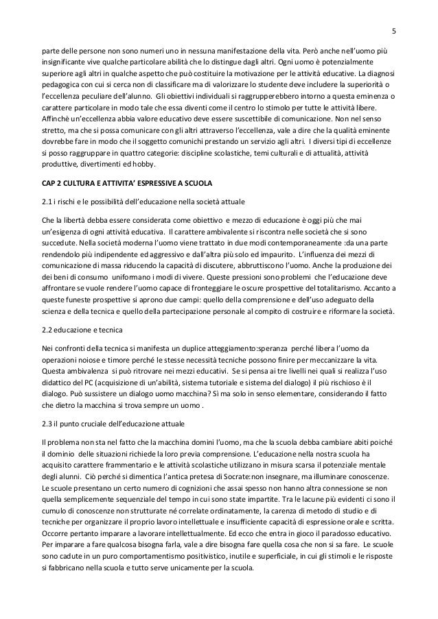 5. 5. 5 parte delle persone non sono numeri uno in nessuna manifestazione della vita. Però anche nell’uomo più insignificante vive qualche particolare abilità che lo distingue dagli altri. Ogni uomo è potenzialmente superiore agli altri in qualche aspetto che può costituire la motivazione per le attività educative. La diagnosi pedagogica con cui si cerca non di classificare ma di valorizzare lo studente deve includere la superiorità o l’eccellenza peculiare dell’alunno. Gli obiettivi individuali si raggrupperebbero intorno a questa eminenza o carattere particolare in modo tale che essa diventi come il centro lo stimolo per tutte le attività libere. Affinchè un’eccellenza abbia valore educativo deve essere suscettibile di comunicazione. Non nel senso stretto, ma che si possa comunicare con gli altri attraverso l’eccellenza, vale a dire che la qualità eminente dovrebbe fare in modo che il soggetto comunichi prestando un servizio agli altri. I diversi tipi di eccellenze si posso raggruppare in quattro categorie: discipline scolastiche, temi culturali e di attualità, attività produttive, divertimenti ed hobby. CAP 2 CULTURA E ATTIVITA’ ESPRESSIVE A SCUOLA 2.1 i rischi e le possibilità dell’educazione nella società attuale Che la libertà debba essere considerata come obiettivo e mezzo di educazione è oggi più che mai un’esigenza di ogni attività educativa. Il carattere ambivalente si riscontra nelle società che si sono succedute. Nella società moderna l’uomo viene trattato in due modi contemporaneamente :da una parte rendendolo più indipendente ed aggressivo e dall’altra più solo ed impaurito. L’influenza dei mezzi di comunicazione di massa riducendo la capacità di discutere, abbruttiscono l’uomo. Anche la produzione dei dei beni di consumo uniformano i modi di vivere. Queste pressioni sono problemi che l’educazione deve affrontare se vuole rendere l’uomo capace di fronteggiare le oscure prospettive del totalitarismo. Accanto a queste funeste prospettive si aprono due campi: quello della comprensione e dell’uso adeguato della scienza e della tecnica e quello della partecipazione personale al compito di costruire e riformare la società. 2.2 educazione e tecnica Nei confronti della tecnica si manifesta un duplice atteggiamento:speranza perché libera l’uomo da operazioni noiose e timore perché le stesse necessità tecniche possono finire per meccanizzare la vita. Questa ambivalenza si può ritrovare nei mezzi educativi. Se si pensa ai tre livelli nei quali si realizza l’uso didattico del PC (acquisizione di un’abilità, sistema tutoriale e sistema del dialogo) il più rischioso è il dialogo. Può sussistere un dialogo uomo macchina? Sì ma solo in senso elementare, considerando il fatto che dietro la macchina si trova sempre un uomo . 2.3 il punto cruciale dell’educazione attuale Il problema non sta nel fatto che la macchina domini l’uomo, ma che la scuola debba cambiare abiti poiché il dominio delle situazioni richiede la loro previa comprensione. L’educazione nella nostra scuola ha acquisito carattere frammentario e le attività scolastiche utilizzano in misura scarsa il potenziale mentale degli alunni. Ciò perché si dimentica l’antica pretesa di Socrate:non insegnare, ma illuminare conoscenze. Le scuole presentano un certo numero di cognizioni che assai spesso non hanno altra connessione se non quella semplicemente sequenziale del tempo in cui sono state impartite. Tra le lacune più evidenti ci sono il cumulo di conoscenze non strutturate né correlate ordinatamente, la carenza di metodo di studio e di tecniche per organizzare il proprio lavoro intellettuale e insufficiente capacità di espressione orale e scritta. Occorre pertanto imparare a lavorare intellettualmente. Ed ecco che entra in gioco il paradosso educativo. Per imparare a fare qualcosa bisogna farla, vale a dire bisogna fare quella cosa che non si sa fare. Le scuole sono cadute in un puro comportamentismo positivistico, inutile e superficiale, in cui gli stimoli e le risposte si fabbricano nella scuola e tutto serve unicamente per la scuola.