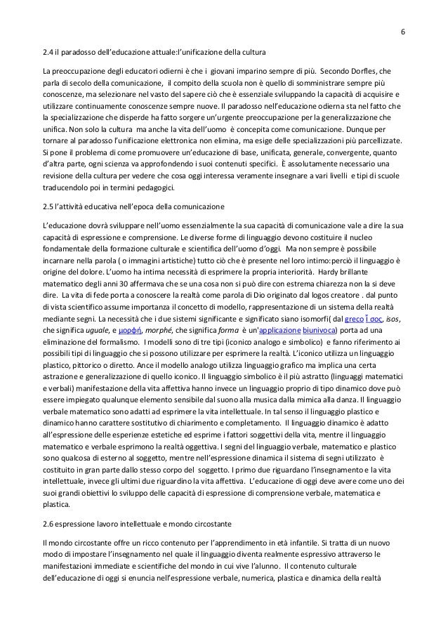 6. 6. 6 2.4 il paradosso dell’educazione attuale:l’unificazione della cultura La preoccupazione degli educatori odierni è che i giovani imparino sempre di più. Secondo Dorfles, che parla di secolo della comunicazione, il compito della scuola non è quello di somministrare sempre più conoscenze, ma selezionare nel vasto del sapere ciò che è essenziale sviluppando la capacità di acquisire e utilizzare continuamente conoscenze sempre nuove. Il paradosso nell’educazione odierna sta nel fatto che la specializzazione che disperde ha fatto sorgere un’urgente preoccupazione per la generalizzazione che unifica. Non solo la cultura ma anche la vita dell’uomo è concepita come comunicazione. Dunque per tornare al paradosso l’unificazione elettronica non elimina, ma esige delle specializzazioni più parcellizzate. Si pone il problema di come promuovere un’educazione di base, unificata, generale, convergente, quanto d’altra parte, ogni scienza va approfondendo i suoi contenuti specifici. È assolutamente necessario una revisione della cultura per vedere che cosa oggi interessa veramente insegnare a vari livelli e tipi di scuole traducendolo poi in termini pedagogici. 2.5 l’attività educativa nell’epoca della comunicazione L’educazione dovrà sviluppare nell’uomo essenzialmente la sua capacità di comunicazione vale a dire la sua capacità di espressione e comprensione. Le diverse forme di linguaggio devono costituire il nucleo fondamentale della formazione culturale e scientifica dell’uomo d’oggi. Ma non sempre è possibile incarnare nella parola ( o immagini artistiche) tutto ciò che è presente nel loro intimo:perciò il linguaggio è origine del dolore. L’uomo ha intima necessità di esprimere la propria interiorità. Hardy brillante matematico degli anni 30 affermava che se una cosa non si può dire con estrema chiarezza non la si deve dire. La vita di fede porta a conoscere la realtà come parola di Dio originato dal logos creatore . dal punto di vista scientifico assume importanza il concetto di modello, rappresentazione di un sistema della realtà mediante segni. La necessità che i due sistemi significante e significato siano isomorfi( dal greco ἴ σος, isos, che significa uguale, e μορφή, morphé, che significa forma è un'applicazione biunivoca) porta ad una eliminazione del formalismo. I modelli sono di tre tipi (iconico analogo e simbolico) e fanno riferimento ai possibili tipi di linguaggio che si possono utilizzare per esprimere la realtà. L’iconico utilizza un linguaggio plastico, pittorico o diretto. Ance il modello analogo utilizza linguaggio grafico ma implica una certa astrazione e generalizzazione di quello iconico. Il linguaggio simbolico è il più astratto (linguaggi matematici e verbali) manifestazione della vita affettiva hanno invece un linguaggio proprio di tipo dinamico dove può essere impiegato qualunque elemento sensibile dal suono alla musica dalla mimica alla danza. Il linguaggio verbale matematico sono adatti ad esprimere la vita intellettuale. In tal senso il linguaggio plastico e dinamico hanno carattere sostitutivo di chiarimento e completamento. Il linguaggio dinamico è adatto all’espressione delle esperienze estetiche ed esprime i fattori soggettivi della vita, mentre il linguaggio matematico e verbale esprimono la realtà oggettiva. I segni del linguaggio verbale, matematico e plastico sono qualcosa di esterno al soggetto, mentre nell’espressione dinamica il sistema di segni utilizzato è costituito in gran parte dallo stesso corpo del soggetto. I primo due riguardano l’insegnamento e la vita intellettuale, invece gli ultimi due riguardino la vita affettiva. L’educazione di oggi deve avere come uno dei suoi grandi obiettivi lo sviluppo delle capacità di espressione di comprensione verbale, matematica e plastica. 2.6 espressione lavoro intellettuale e mondo circostante Il mondo circostante offre un ricco contenuto per l’apprendimento in età infantile. Si tratta di un nuovo modo di impostare l’insegnamento nel quale il linguaggio diventa realmente espressivo attraverso le manifestazioni immediate e scientifiche del mondo in cui vive l’alunno. Il contenuto culturale dell’educazione di oggi si enuncia nell’espressione verbale, numerica, plastica e dinamica della realtà