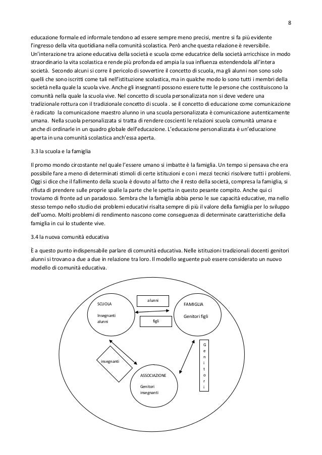 8. 8. 8 educazione formale ed informale tendono ad essere sempre meno precisi, mentre si fa più evidente l’ingresso della vita quotidiana nella comunità scolastica. Però anche questa relazione è reversibile. Un’interazione tra azione educativa della società e scuola come educatrice della società arricchisce in modo straordinario la vita scolastica e rende più profonda ed ampia la sua influenza estendendola all’intera società. Secondo alcuni si corre il pericolo di sovvertire il concetto di scuola, ma gli alunni non sono solo quelli che sono iscritti come tali nell’istituzione scolastica, ma in qualche modo lo sono tutti i membri della società nella quale la scuola vive. Anche gli insegnanti possono essere tutte le persone che costituiscono la comunità nella quale la scuola vive. Nel concetto di scuola personalizzata non si deve vedere una tradizionale rottura con il tradizionale concetto di scuola . se il concetto di educazione come comunicazione è radicato la comunicazione maestro alunno in una scuola personalizzata è comunicazione autenticamente umana. Nella scuola personalizzata si tratta di rendere coscienti le relazioni scuola comunità umana e anche di ordinarle in un quadro globale dell’educazione. L’educazione personalizzata è un’educazione aperta in una comunità scolastica anch’essa aperta. 3.3 la scuola e la famiglia Il promo mondo circostante nel quale l’essere umano si imbatte è la famiglia. Un tempo si pensava che era possibile fare a meno di determinati stimoli di certe istituzioni e con i mezzi tecnici risolvere tutti i problemi. Oggi si dice che il fallimento della scuola è dovuto al fatto che il resto della società, compresa la famiglia, si rifiuta di prendere sulle proprie spalle la parte che le spetta in questo pesante compito. Anche qui ci troviamo di fronte ad un paradosso. Sembra che la famiglia abbia perso le sue capacità educative, ma nello stesso tempo nello studio dei problemi educativi risalta sempre di più il valore della famiglia per lo sviluppo dell’uomo. Molti problemi di rendimento nascono come conseguenza di determinate caratteristiche della famiglia in cui lo studente vive. 3.4 la nuova comunità educativa È a questo punto indispensabile parlare di comunità educativa. Nelle istituzioni tradizionali docenti genitori alunni si trovano a due a due in relazione tra loro. Il modello seguente può essere considerato un nuovo modello di comunità educativa. SCUOLA Insegnanti alunni alunni figli insegnanti ASSOCIAZIONE Genitori insegnanti FAMIGLIA Genitori figli G e n i t o r i