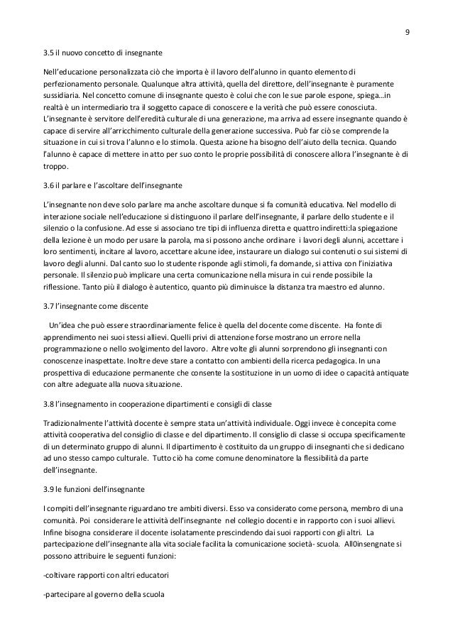 9. 9. 9 3.5 il nuovo concetto di insegnante Nell’educazione personalizzata ciò che importa è il lavoro dell’alunno in quanto elemento di perfezionamento personale. Qualunque altra attività, quella del direttore, dell’insegnante è puramente sussidiaria. Nel concetto comune di insegnante questo è colui che con le sue parole espone, spiega…in realtà è un intermediario tra il soggetto capace di conoscere e la verità che può essere conosciuta. L’insegnante è servitore dell’eredità culturale di una generazione, ma arriva ad essere insegnante quando è capace di servire all’arricchimento culturale della generazione successiva. Può far ciò se comprende la situazione in cui si trova l’alunno e lo stimola. Questa azione ha bisogno dell’aiuto della tecnica. Quando l’alunno è capace di mettere in atto per suo conto le proprie possibilità di conoscere allora l’insegnante è di troppo. 3.6 il parlare e l’ascoltare dell’insegnante L’insegnante non deve solo parlare ma anche ascoltare dunque si fa comunità educativa. Nel modello di interazione sociale nell’educazione si distinguono il parlare dell’insegnante, il parlare dello studente e il silenzio o la confusione. Ad esse si associano tre tipi di influenza diretta e quattro indiretti:la spiegazione della lezione è un modo per usare la parola, ma si possono anche ordinare i lavori degli alunni, accettare i loro sentimenti, incitare al lavoro, accettare alcune idee, instaurare un dialogo sui contenuti o sui sistemi di lavoro degli alunni. Dal canto suo lo studente risponde agli stimoli, fa domande, si attiva con l’iniziativa personale. Il silenzio può implicare una certa comunicazione nella misura in cui rende possibile la riflessione. Tanto più il dialogo è autentico, quanto più diminuisce la distanza tra maestro ed alunno. 3.7 l’insegnante come discente Un’idea che può essere straordinariamente felice è quella del docente come discente. Ha fonte di apprendimento nei suoi stessi allievi. Quelli privi di attenzione forse mostrano un errore nella programmazione o nello svolgimento del lavoro. Altre volte gli alunni sorprendono gli insegnanti con conoscenze inaspettate. Inoltre deve stare a contatto con ambienti della ricerca pedagogica. In una prospettiva di educazione permanente che consente la sostituzione in un uomo di idee o capacità antiquate con altre adeguate alla nuova situazione. 3.8 l’insegnamento in cooperazione dipartimenti e consigli di classe Tradizionalmente l’attività docente è sempre stata un’attività individuale. Oggi invece è concepita come attività cooperativa del consiglio di classe e del dipartimento. Il consiglio di classe si occupa specificamente di un determinato gruppo di alunni. Il dipartimento è costituito da un gruppo di insegnanti che si dedicano ad uno stesso campo culturale. Tutto ciò ha come comune denominatore la flessibilità da parte dell’insegnante. 3.9 le funzioni dell’insegnante I compiti dell’insegnante riguardano tre ambiti diversi. Esso va considerato come persona, membro di una comunità. Poi considerare le attività dell’insegnante nel collegio docenti e in rapporto con i suoi allievi. Infine bisogna considerare il docente isolatamente prescindendo dai suoi rapporti con gli altri. La partecipazione dell’insegnante alla vita sociale facilita la comunicazione società- scuola. All0insengnate si possono attribuire le seguenti funzioni: -coltivare rapporti con altri educatori -partecipare al governo della scuola