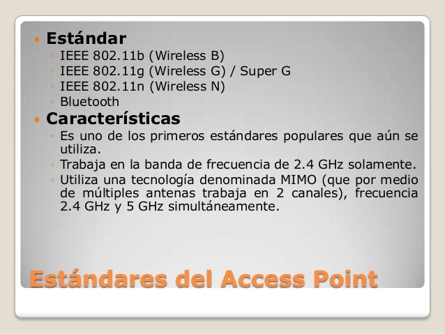 11. 11. Estándares del Access Point  Estándar ◦ IEEE 802.11b (Wireless B) ◦ IEEE 802.11g (Wireless G) / Super G ◦ IEEE 802.11n (Wireless N) ◦ Bluetooth  Características ◦ Es uno de los primeros estándares populares que aún se utiliza. ◦ Trabaja en la banda de frecuencia de 2.4 GHz solamente. ◦ Utiliza una tecnología denominada MIMO (que por medio de múltiples antenas trabaja en 2 canales), frecuencia 2.4 GHz y 5 GHz simultáneamente.