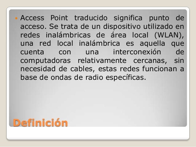 2. 2. Definición  Access Point traducido significa punto de acceso. Se trata de un dispositivo utilizado en redes inalámbricas de área local (WLAN), una red local inalámbrica es aquella que cuenta con una interconexión de computadoras relativamente cercanas, sin necesidad de cables, estas redes funcionan a base de ondas de radio específicas.