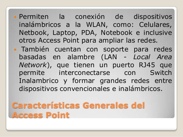 4. 4. Características Generales del Access Point  Permiten la conexión de dispositivos inalámbricos a la WLAN, como: Celulares, Netbook, Laptop, PDA, Notebook e inclusive otros Access Point para ampliar las redes.  También cuentan con soporte para redes basadas en alambre (LAN - Local Area Network), que tienen un puerto RJ45 que permite interconectarse con Switch Inalambrico y formar grandes redes entre dispositivos convencionales e inalámbricos.