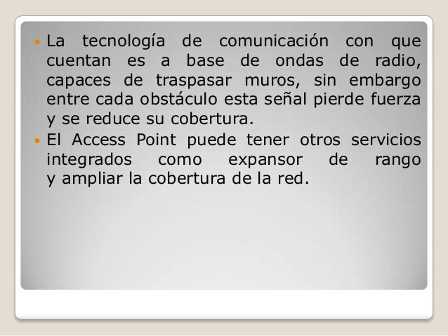5. 5.  La tecnología de comunicación con que cuentan es a base de ondas de radio, capaces de traspasar muros, sin embargo entre cada obstáculo esta señal pierde fuerza y se reduce su cobertura.  El Access Point puede tener otros servicios integrados como expansor de rango y ampliar la cobertura de la red.