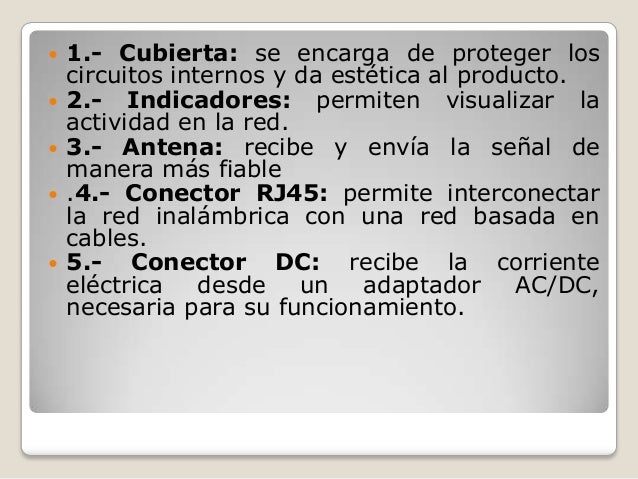 8. 8.  1.- Cubierta: se encarga de proteger los circuitos internos y da estética al producto.  2.- Indicadores: permiten visualizar la actividad en la red.  3.- Antena: recibe y envía la señal de manera más fiable  .4.- Conector RJ45: permite interconectar la red inalámbrica con una red basada en cables.  5.- Conector DC: recibe la corriente eléctrica desde un adaptador AC/DC, necesaria para su funcionamiento.