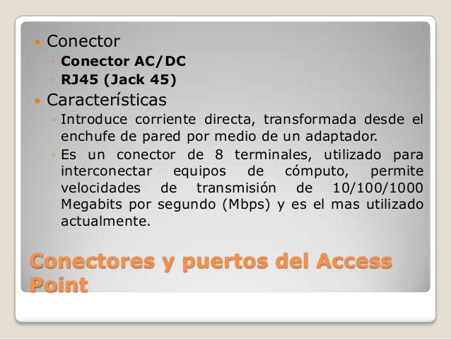 9. 9. Conectores y puertos del Access Point  Conector ◦ Conector AC/DC ◦ RJ45 (Jack 45)  Características ◦ Introduce corriente directa, transformada desde el enchufe de pared por medio de un adaptador. ◦ Es un conector de 8 terminales, utilizado para interconectar equipos de cómputo, permite velocidades de transmisión de 10/100/1000 Megabits por segundo (Mbps) y es el mas utilizado actualmente.
