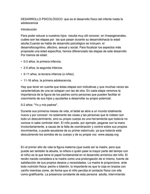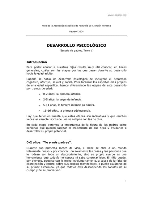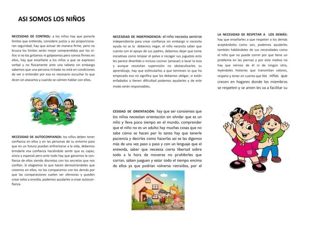 4. 4. «Creo que los niños son nuestro futuro. Enseñarlos bien, y deja que abran el camino, muéstrales la belleza que poseen en su interior, fomenta su amor propio para facilitarles la labor, deja que la risa de los niños nos recuerde cómo éramos.,.» Linda Creed, compositora Este capítulo trata de cómo: • Estar dispuestos a aceptar que nuestros hijos tomen la iniciativa para que tengan la Oportunidad de expresar sus sentimientos, necesidades e intereses; • Influimos en las oportunidades que tienen nuestros hijos para desarrollar su amor propio y percibir su belleza interior; • Llegar a conocer a nuestros hijos dedicando tiempo a descubrir, aguardar y escuchar sus intentos por comunicarse. • Saber que esperar de nuestros hijos. Todo depende de usted Como padres, desempeñamos muchos papeles ... a veces, todos a la vez. Tenemos que hacer de policía, pero que trata de ser un amigo, de narrador de cuentos que también hace de chofer, y de cambiador de pañales especializado en evitar accidentes. A veces se nos olvida que la forma como realizamos estas funciones influye en las oportunidades que tiene nuestro hijo para aprender. Se nos olvida que todo depende de cómo hacemos aquello que hacemos. Cuando hacemos de «ayudante»
