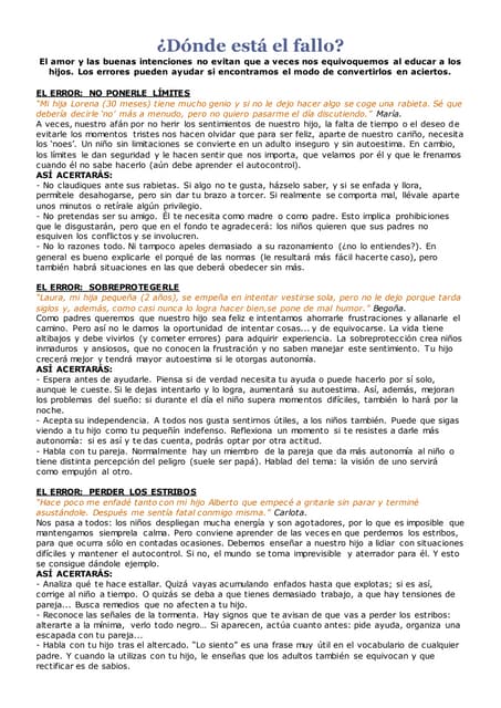 41. 41. 2. Cuando nuestra hija muestra interés —podemos agregar información Al principio, cuando nos damos cuenta de lo que llama la atención a nuestros hijos, estamos tan contentos de entenderlos que con frecuencia les damos de inmediato lo que quieren. Pero podemos aprovechar estas oportunidades para que oigan, vean o toquen la información específica que les ayudará a comprender el lenguaje y, a la larga, a emplearlo. Parle a una niña lo que quiere, sosteniendo el objeto en la mano firmemente unos segundos, nos da la oportunidad de «compartir el momento» y de agregar las palabras que la ayudarán a aprender. 3. Cuando sucede algo fuera de lo común —podemos agregar información Cuando se cae una cuchara, se zafa un botón, hay un fuerte ruido, o falta un calcetín. ..nos sorprendemos y prestamos atención. El interés que despierta facilita «compartir el momento», muy oportuno además, para agregar la información que ayudará a nuestro hijo a aprender. 4. Cuando las cosas salen mal — podemos dar explicaciones y agregar información