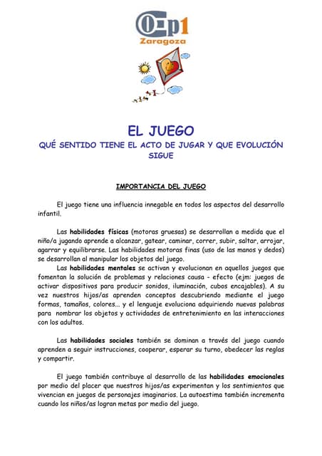 71. 71. lavar el auto, tender las camas, doblar la ropa, limpiar los espejos y poner la mesa, pueden transformarse en juego si dejamos que nuestros hijos participen. Al principia Como se desarrolla la capacidad de jugar El niño desarrolla poco a poco su capacidad de turnarse. El tener expectativas realistas sobre dicha capacidad, nos asegura que el juego continúe y que ambos lo disfrutemos. Las escenas representadas abajo nos ayudarán a reconocer cómo desarrolla nuestro hijo la capacidad de participar en un juego. Al principia El turno de nuestro hijo es cualquier reacción ante nuestro juego de «te voy a agarrar!», «tortillitas», y «veo, veo». Cuando sonreímos, hablamos o jugamos con nuestro hijo, él nos mira, nos sonríe, se mueve o vocal iza. Es posible que se enoje si interrumpimos la interacción que está disfrutando. Luego Los sonidos producidos por nuestro hijo y su expresión corporal, nos advierten que ya sabe lo que viene y que quiere seguir jugando. Por ejemplo, silo sentamos en las piernas, le hacemos «caballito» y luego paramos, va a querer que lo hagamos otra vez. O quizá quiera salir corriendo cuando al jugar a la ronda llegue la parte de «Lobo, ¿estás?» Si no reaccionamos, nuestro hijo va a persistir en sus esfuerzos por hacernos entender que quiere seguir con la diversión. Ms adelante Nuestro hijo inicia el juego y espera que nosotros respondamos mediante sonidos, palabras o acciones ligadas al juego. Ha llegado el momento en que es capaz de asumir el papel que era el nuestro e iniciar él mismo el