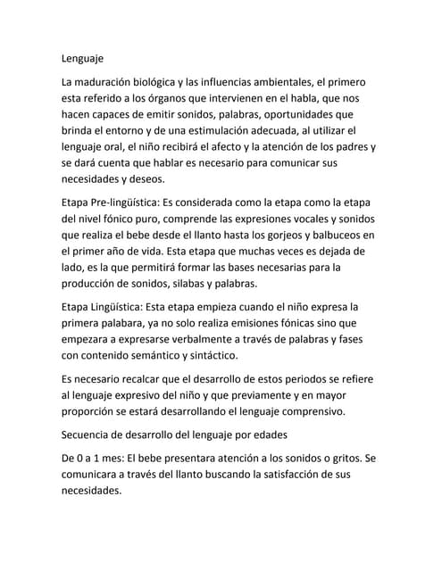 36. 36. Al ser sensibles a la gama de estados de ánimo y comportamientos que manifiesta Nuestro hijo • Se da cuenta de que estamos interesados en él y en lo que dice • Tal vez trate de responder Agregue lenguaje y experiencia Este capítulo Trata hacer para ayudar a nuestro hijo a lo que podemos decir y comprender y a aprender el lenguaje, las formas de recalcar la información para que le sea más fácil asimilarla; agregar lenguaje y experiencia adecuados a su nivel de desarrollo; enriquecer los momentos que compartimos con ellos, convirtiéndolos en oportunidades para mejorar su capacidad de comunicarse. El lenguaje se empieza a aprender desde el nacimiento Cuando nuestro hijo se comporta en formas fáciles de comprender, instintivamente nos adaptamos para compartir esos momentos y agregamos información. Sin darnos cuenta, hacemos muchos ajustes en nuestra forma de hablar que ayudan a nuestros hijos a aprender. Sucede con mucha facilidad y naturalidad cuando nuestro hijo esta’ sano y nosotros estamos relajados y dispuestos a responder. Copiamos los movimientos, sonidos y palabras de nuestro hijo para confirmar que lo hemos escuchado. Modelamos el lenguaje correcto para proporcionarle la información que necesita para expresarse.