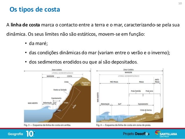 10. 10. A linha de costa marca o contacto entre a terra e o mar, caracterizando-se pela sua dinâmica. Os seus limites não são estáticos, movem-se em função: • da maré; • das condições dinâmicas do mar (variam entre o verão e o inverno); • dos sedimentos erodidos ou que aí são depositados. Os tipos de costa 10