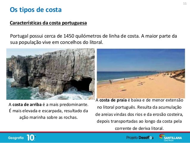 11. 11. A costa de arriba é a mais predominante. É mais elevada e escarpada, resultado da ação marinha sobre as rochas. Os tipos de costa A costa de praia é baixa e de menor extensão no litoral português. Resulta da acumulação de areias vindas dos rios e da erosão costeira, depois transportadas ao longo da costa pela corrente de deriva litoral. Características da costa portuguesa Portugal possui cerca de 1450 quilómetros de linha de costa. A maior parte da sua população vive em concelhos do litoral. 11