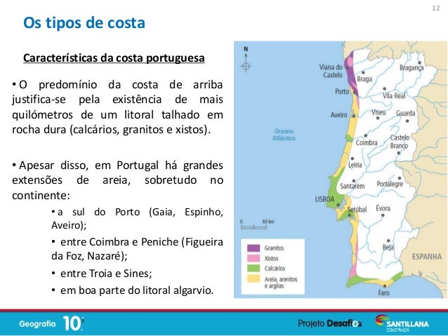 12. 12. • O predomínio da costa de arriba justifica-se pela existência de mais quilómetros de um litoral talhado em rocha dura (calcários, granitos e xistos). • Apesar disso, em Portugal há grandes extensões de areia, sobretudo no continente: • a sul do Porto (Gaia, Espinho, Aveiro); • entre Coimbra e Peniche (Figueira da Foz, Nazaré); • entre Troia e Sines; • em boa parte do litoral algarvio. Os tipos de costa Características da costa portuguesa 12