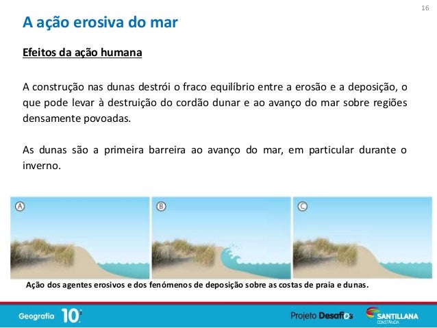16. 16. A ação erosiva do mar A construção nas dunas destrói o fraco equilíbrio entre a erosão e a deposição, o que pode levar à destruição do cordão dunar e ao avanço do mar sobre regiões densamente povoadas. As dunas são a primeira barreira ao avanço do mar, em particular durante o inverno. Ação dos agentes erosivos e dos fenómenos de deposição sobre as costas de praia e dunas. Efeitos da ação humana 16