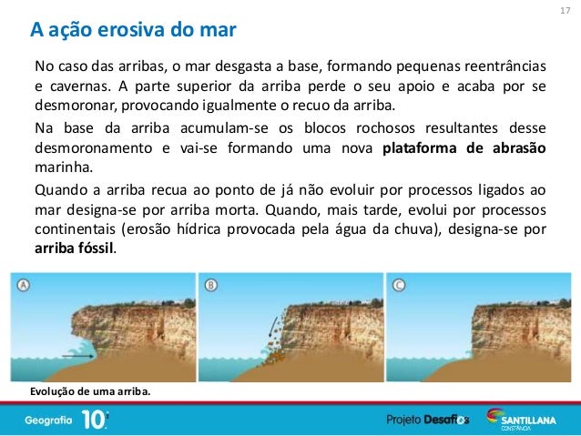 17. 17. No caso das arribas, o mar desgasta a base, formando pequenas reentrâncias e cavernas. A parte superior da arriba perde o seu apoio e acaba por se desmoronar, provocando igualmente o recuo da arriba. Na base da arriba acumulam-se os blocos rochosos resultantes desse desmoronamento e vai-se formando uma nova plataforma de abrasão marinha. Quando a arriba recua ao ponto de já não evoluir por processos ligados ao mar designa-se por arriba morta. Quando, mais tarde, evolui por processos continentais (erosão hídrica provocada pela água da chuva), designa-se por arriba fóssil. A ação erosiva do mar Evolução de uma arriba. 17