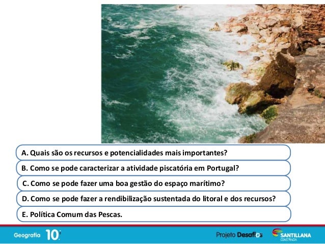 2. 2. A. Quais são os recursos e potencialidades mais importantes? B. Como se pode caracterizar a atividade piscatória em Portugal? C. Como se pode fazer uma boa gestão do espaço marítimo? D. Como se pode fazer a rendibilização sustentada do litoral e dos recursos? E. Política Comum das Pescas. 2