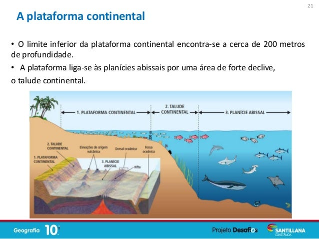21. 21. • O limite inferior da plataforma continental encontra-se a cerca de 200 metros de profundidade. • A plataforma liga-se às planícies abissais por uma área de forte declive, o talude continental. A plataforma continental 21