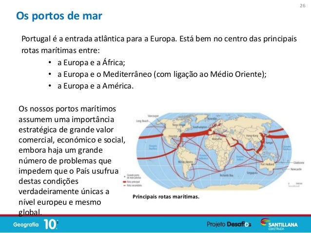 26. 26. Portugal é a entrada atlântica para a Europa. Está bem no centro das principais rotas marítimas entre: • a Europa e a África; • a Europa e o Mediterrâneo (com ligação ao Médio Oriente); • a Europa e a América. Os portos de mar Os nossos portos marítimos assumem uma importância estratégica de grande valor comercial, económico e social, embora haja um grande número de problemas que impedem que o País usufrua destas condições verdadeiramente únicas a nível europeu e mesmo global. 26 Principais rotas marítimas.