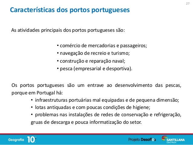 27. 27. As atividades principais dos portos portugueses são: • comércio de mercadorias e passageiros; • navegação de recreio e turismo; • construção e reparação naval; • pesca (empresarial e desportiva). Os portos portugueses são um entrave ao desenvolvimento das pescas, porque em Portugal há: • infraestruturas portuárias mal equipadas e de pequena dimensão; • lotas antiquadas e com poucas condições de higiene; • problemas nas instalações de redes de conservação e refrigeração, gruas de descarga e pouca informatização do setor. Características dos portos portugueses 27