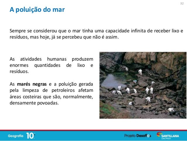 32. 32. Sempre se considerou que o mar tinha uma capacidade infinita de receber lixo e resíduos, mas hoje, já se percebeu que não é assim. A poluição do mar As atividades humanas produzem enormes quantidades de lixo e resíduos. As marés negras e a poluição gerada pela limpeza de petroleiros afetam áreas costeiras que são, normalmente, densamente povoadas. 32