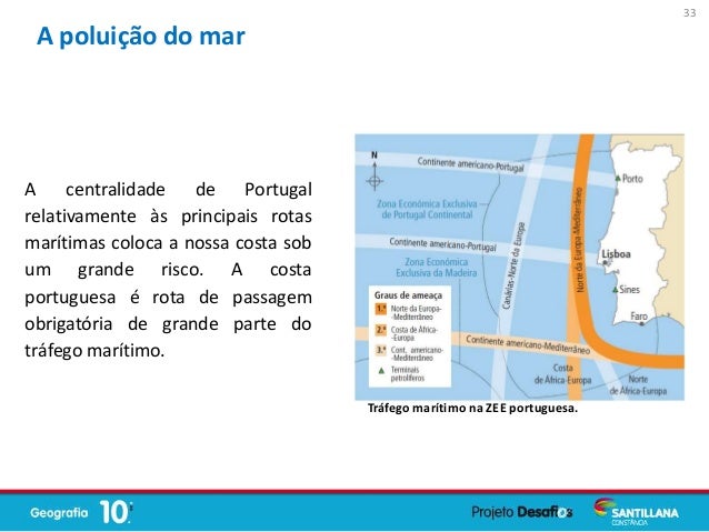 33. 33. A centralidade de Portugal relativamente às principais rotas marítimas coloca a nossa costa sob um grande risco. A costa portuguesa é rota de passagem obrigatória de grande parte do tráfego marítimo. A poluição do mar 33 Tráfego marítimo na ZEE portuguesa.