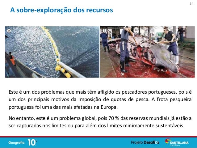 34. 34. Este é um dos problemas que mais têm afligido os pescadores portugueses, pois é um dos principais motivos da imposição de quotas de pesca. A frota pesqueira portuguesa foi uma das mais afetadas na Europa. No entanto, este é um problema global, pois 70 % das reservas mundiais já estão a ser capturadas nos limites ou para além dos limites minimamente sustentáveis. A sobre-exploração dos recursos 34