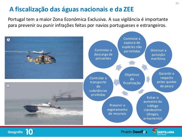 35. 35. Portugal tem a maior Zona Económica Exclusiva. A sua vigilância é importante para prevenir ou punir infrações feitas por navios portugueses e estrangeiros. Objetivos da fiscalização Controlar a captura de espécies não permitidas Diminuir a poluição marítima. Garantir o respeito pelas quotas de pesca Evitar o aumento do tráfego clandestino (drogas, armamento) Prevenir o esgotamento de recursos Controlar o transporte de substâncias proibidas Controlar a descarga de poluentes A fiscalização das águas nacionais e da ZEE 35