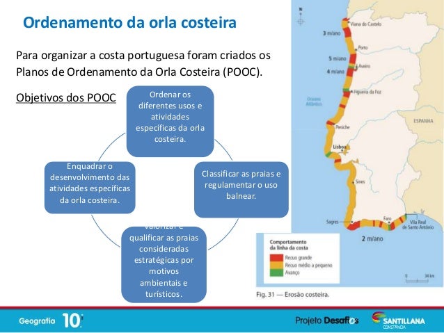 39. 39. Para organizar a costa portuguesa foram criados os Planos de Ordenamento da Orla Costeira (POOC). Objetivos dos POOC Ordenamento da orla costeira Ordenar os diferentes usos e atividades específicas da orla costeira. Classificar as praias e regulamentar o uso balnear. Valorizar e qualificar as praias consideradas estratégicas por motivos ambientais e turísticos. Enquadrar o desenvolvimento das atividades específicas da orla costeira. 39