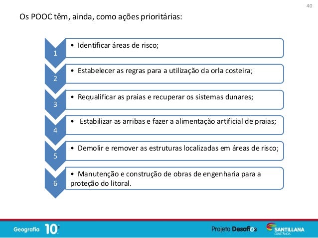 40. 40. Os POOC têm, ainda, como ações prioritárias: 1 • Identificar áreas de risco; 2 • Estabelecer as regras para a utilização da orla costeira; 3 • Requalificar as praias e recuperar os sistemas dunares; 4 • Estabilizar as arribas e fazer a alimentação artificial de praias; 5 • Demolir e remover as estruturas localizadas em áreas de risco; 6 • Manutenção e construção de obras de engenharia para a proteção do litoral. 40