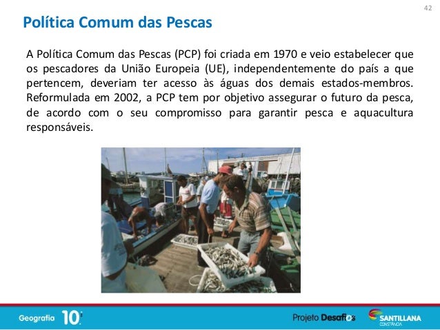 42. 42. A Política Comum das Pescas (PCP) foi criada em 1970 e veio estabelecer que os pescadores da União Europeia (UE), independentemente do país a que pertencem, deveriam ter acesso às águas dos demais estados-membros. Reformulada em 2002, a PCP tem por objetivo assegurar o futuro da pesca, de acordo com o seu compromisso para garantir pesca e aquacultura responsáveis. Política Comum das Pescas 42