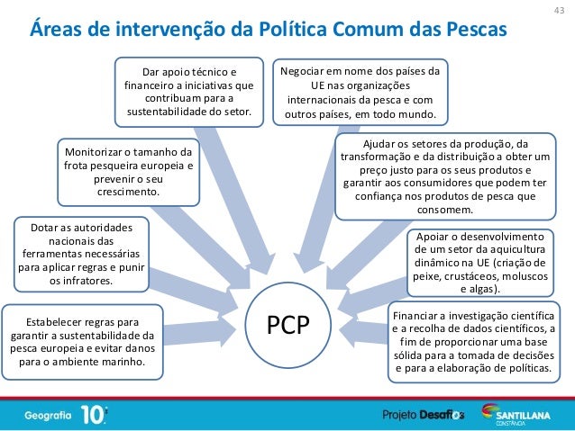 43. 43. PCPEstabelecer regras para garantir a sustentabilidade da pesca europeia e evitar danos para o ambiente marinho. Dotar as autoridades nacionais das ferramentas necessárias para aplicar regras e punir os infratores. Monitorizar o tamanho da frota pesqueira europeia e prevenir o seu crescimento. Dar apoio técnico e financeiro a iniciativas que contribuam para a sustentabilidade do setor. Negociar em nome dos países da UE nas organizações internacionais da pesca e com outros países, em todo mundo. Ajudar os setores da produção, da transformação e da distribuição a obter um preço justo para os seus produtos e garantir aos consumidores que podem ter confiança nos produtos de pesca que consomem. Apoiar o desenvolvimento de um setor da aquicultura dinâmico na UE (criação de peixe, crustáceos, moluscos e algas). Financiar a investigação científica e a recolha de dados científicos, a fim de proporcionar uma base sólida para a tomada de decisões e para a elaboração de políticas. Áreas de intervenção da Política Comum das Pescas 43