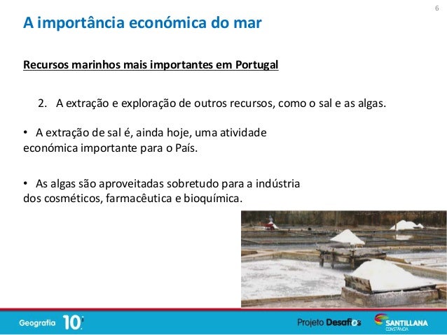 6. 6. A importância económica do mar • A extração de sal é, ainda hoje, uma atividade económica importante para o País. • As algas são aproveitadas sobretudo para a indústria dos cosméticos, farmacêutica e bioquímica. 2. A extração e exploração de outros recursos, como o sal e as algas. Recursos marinhos mais importantes em Portugal 6