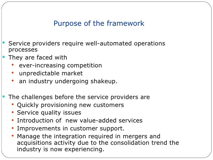 2. 2. Purpose of the framework <ul><li>Service providers require well-automated operations processes </li></ul><ul><li>They are faced with </li></ul><ul><ul><li>ever-increasing competition </li></ul></ul><ul><ul><li>unpredictable market </li></ul></ul><ul><ul><li>an industry undergoing shakeup. </li></ul></ul><ul><li>The challenges before the service providers are </li></ul><ul><ul><li>Quickly provisioning new customers </li></ul></ul><ul><ul><li>Service quality issues </li></ul></ul><ul><ul><li>Introduction of new value-added services </li></ul></ul><ul><ul><li>Improvements in customer support. </li></ul></ul><ul><ul><li>Manage the integration required in mergers and acquisitions activity due to the consolidation trend the industry is now experiencing. </li></ul></ul>