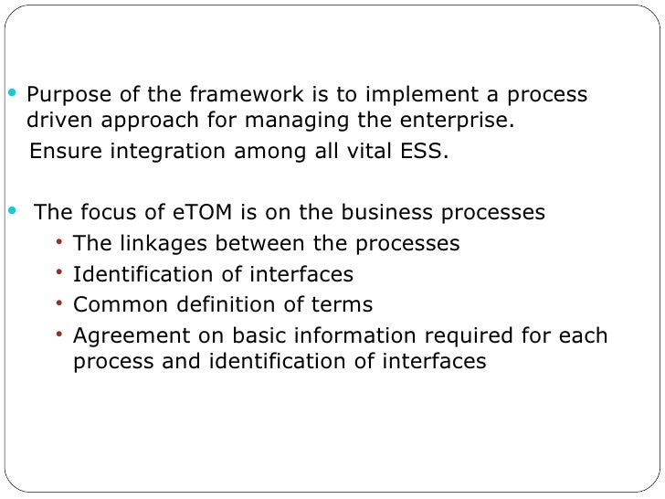 4. 4. <ul><li>Purpose of the framework is to implement a process driven approach for managing the enterprise. </li></ul><ul><li>Ensure integration among all vital ESS. </li></ul><ul><li>The focus of eTOM is on the business processes </li></ul><ul><ul><ul><li>The linkages between the processes </li></ul></ul></ul><ul><ul><ul><li>Identification of interfaces </li></ul></ul></ul><ul><ul><ul><li>Common definition of terms </li></ul></ul></ul><ul><ul><ul><li>Agreement on basic information required for each process and identification of interfaces </li></ul></ul></ul>
