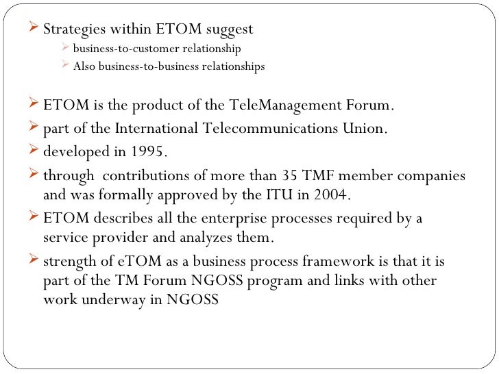 6. 6. <ul><li>Strategies within ETOM suggest </li></ul><ul><ul><ul><li>business-to-customer relationship </li></ul></ul></ul><ul><ul><ul><li>Also business-to-business relationships </li></ul></ul></ul><ul><li>ETOM is the product of the TeleManagement Forum. </li></ul><ul><li>part of the International Telecommunications Union. </li></ul><ul><li>developed in 1995. </li></ul><ul><li>through contributions of more than 35 TMF member companies and was formally approved by the ITU in 2004. </li></ul><ul><li>ETOM describes all the enterprise processes required by a service provider and analyzes them. </li></ul><ul><li>strength of eTOM as a business process framework is that it is part of the TM Forum NGOSS program and links with other work underway in NGOSS </li></ul>