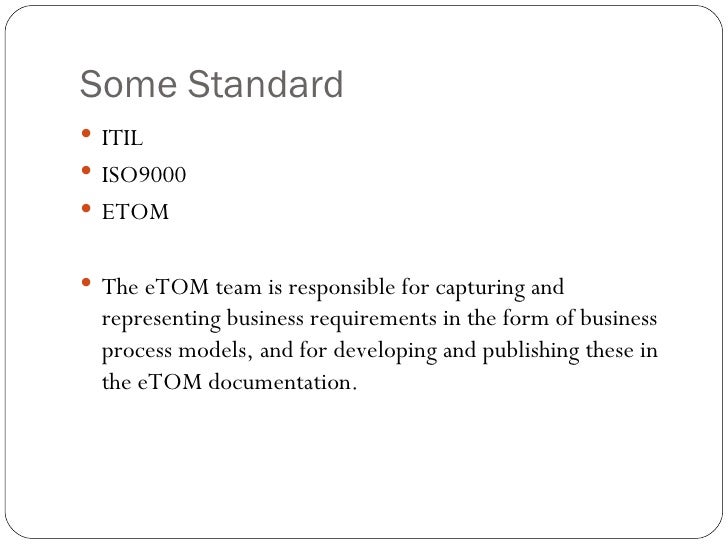 7. 9. Some Standard <ul><li>ITIL </li></ul><ul><li>ISO9000 </li></ul><ul><li>ETOM </li></ul><ul><li>The eTOM team is responsible for capturing and representing business requirements in the form of business process models, and for developing and publishing these in the eTOM documentation. </li></ul>
