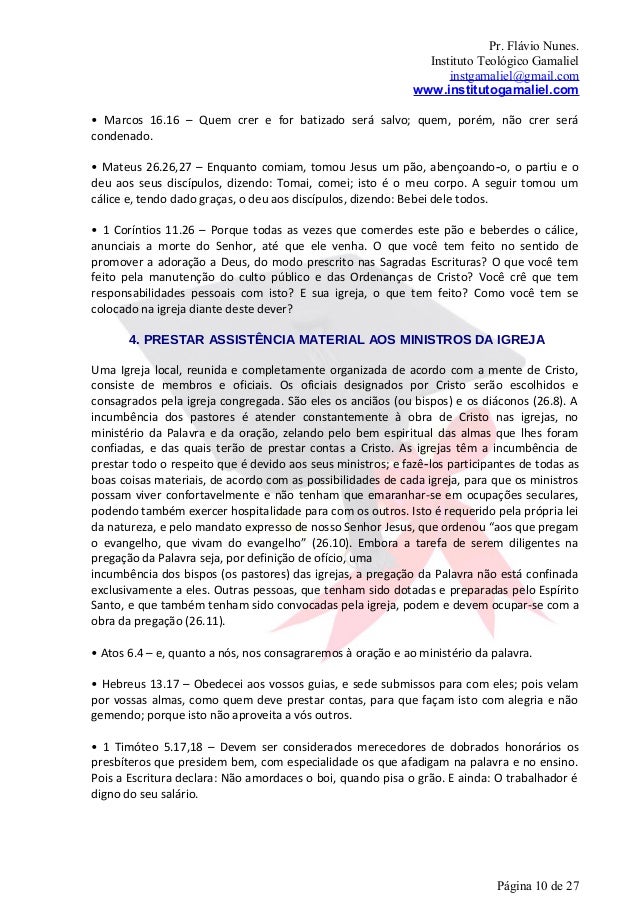 10. 10. Pr. Flávio Nunes. Instituto Teológico Gamaliel instgamaliel@gmail.com www.institutogamaliel.com• Marcos 16.16 – Quem crer e for batizado será salvo; quem, porém, não crer serácondenado.• Mateus 26.26,27 – Enquanto comiam, tomou Jesus um pão, abençoando‐o, o partiu e odeu aos seus discípulos, dizendo: Tomai, comei; isto é o meu corpo. A seguir tomou umcálice e, tendo dado graças, o deu aos discípulos, dizendo: Bebei dele todos.• 1 Coríntios 11.26 – Porque todas as vezes que comerdes este pão e beberdes o cálice,anunciais a morte do Senhor, até que ele venha. O que você tem feito no sentido depromover a adoração a Deus, do modo prescrito nas Sagradas Escrituras? O que você temfeito pela manutenção do culto público e das Ordenanças de Cristo? Você crê que temresponsabilidades pessoais com isto? E sua igreja, o que tem feito? Como você tem secolocado na igreja diante deste dever? 4. PRESTAR ASSISTÊNCIA MATERIAL AOS MINISTROS DA IGREJAUma Igreja local, reunida e completamente organizada de acordo com a mente de Cristo,consiste de membros e oficiais. Os oficiais designados por Cristo serão escolhidos econsagrados pela igreja congregada. São eles os anciãos (ou bispos) e os diáconos (26.8). Aincumbência dos pastores é atender constantemente à obra de Cristo nas igrejas, noministério da Palavra e da oração, zelando pelo bem espiritual das almas que lhes foramconfiadas, e das quais terão de prestar contas a Cristo. As igrejas têm a incumbência deprestar todo o respeito que é devido aos seus ministros; e fazê‐los participantes de todas asboas coisas materiais, de acordo com as possibilidades de cada igreja, para que os ministrospossam viver confortavelmente e não tenham que emaranhar-se em ocupações seculares,podendo também exercer hospitalidade para com os outros. Isto é requerido pela própria leida natureza, e pelo mandato expresso de nosso Senhor Jesus, que ordenou “aos que pregamo evangelho, que vivam do evangelho” (26.10). Embora a tarefa de serem diligentes napregação da Palavra seja, por definição de ofício, umaincumbência dos bispos (os pastores) das igrejas, a pregação da Palavra não está confinadaexclusivamente a eles. Outras pessoas, que tenham sido dotadas e preparadas pelo EspíritoSanto, e que também tenham sido convocadas pela igreja, podem e devem ocupar-se com aobra da pregação (26.11).• Atos 6.4 – e, quanto a nós, nos consagraremos à oração e ao ministério da palavra.• Hebreus 13.17 – Obedecei aos vossos guias, e sede submissos para com eles; pois velampor vossas almas, como quem deve prestar contas, para que façam isto com alegria e nãogemendo; porque isto não aproveita a vós outros.• 1 Timóteo 5.17,18 – Devem ser considerados merecedores de dobrados honorários ospresbíteros que presidem bem, com especialidade os que afadigam na palavra e no ensino.Pois a Escritura declara: Não amordaces o boi, quando pisa o grão. E ainda: O trabalhador édigno do seu salário. Página 10 de 27