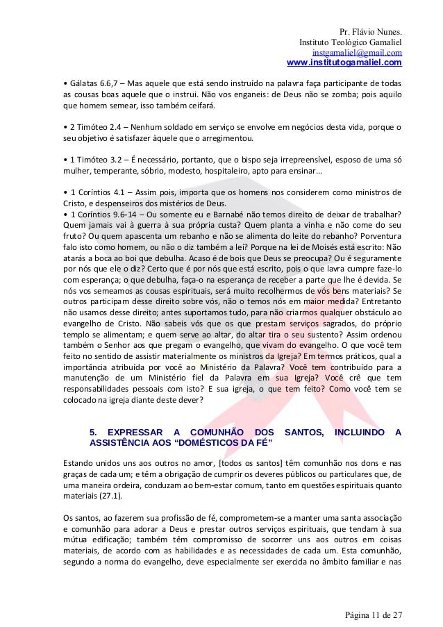 11. 11. Pr. Flávio Nunes. Instituto Teológico Gamaliel instgamaliel@gmail.com www.institutogamaliel.com• Gálatas 6.6,7 – Mas aquele que está sendo instruído na palavra faça participante de todasas cousas boas aquele que o instrui. Não vos enganeis: de Deus não se zomba; pois aquiloque homem semear, isso também ceifará.• 2 Timóteo 2.4 – Nenhum soldado em serviço se envolve em negócios desta vida, porque oseu objetivo é satisfazer àquele que o arregimentou.• 1 Timóteo 3.2 – É necessário, portanto, que o bispo seja irrepreensível, esposo de uma sómulher, temperante, sóbrio, modesto, hospitaleiro, apto para ensinar...• 1 Coríntios 4.1 – Assim pois, importa que os homens nos considerem como ministros deCristo, e despenseiros dos mistérios de Deus.• 1 Coríntios 9.6‐14 – Ou somente eu e Barnabé não temos direito de deixar de trabalhar?Quem jamais vai à guerra à sua própria custa? Quem planta a vinha e não come do seufruto? Ou quem apascenta um rebanho e não se alimenta do leite do rebanho? Porventurafalo isto como homem, ou não o diz também a lei? Porque na lei de Moisés está escrito: Nãoatarás a boca ao boi que debulha. Acaso é de bois que Deus se preocupa? Ou é seguramentepor nós que ele o diz? Certo que é por nós que está escrito, pois o que lavra cumpre faze-locom esperança; o que debulha, faça-o na esperança de receber a parte que lhe é devida. Senós vos semeamos as cousas espirituais, será muito recolhermos de vós bens materiais? Seoutros participam desse direito sobre vós, não o temos nós em maior medida? Entretantonão usamos desse direito; antes suportamos tudo, para não criarmos qualquer obstáculo aoevangelho de Cristo. Não sabeis vós que os que prestam serviços sagrados, do própriotemplo se alimentam; e quem serve ao altar, do altar tira o seu sustento? Assim ordenoutambém o Senhor aos que pregam o evangelho, que vivam do evangelho. O que você temfeito no sentido de assistir materialmente os ministros da Igreja? Em termos práticos, qual aimportância atribuída por você ao Ministério da Palavra? Você tem contribuído para amanutenção de um Ministério fiel da Palavra em sua Igreja? Você crê que temresponsabilidades pessoais com isto? E sua igreja, o que tem feito? Como você tem secolocado na igreja diante deste dever? 5. EXPRESSAR A COMUNHÃO DOS SANTOS, INCLUINDO A ASSISTÊNCIA AOS “DOMÉSTICOS DA FÉ”Estando unidos uns aos outros no amor, [todos os santos] têm comunhão nos dons e nasgraças de cada um; e têm a obrigação de cumprir os deveres públicos ou particulares que, deuma maneira ordeira, conduzam ao bem‐estar comum, tanto em questões espirituais quantomateriais (27.1).Os santos, ao fazerem sua profissão de fé, comprometem‐se a manter uma santa associaçãoe comunhão para adorar a Deus e prestar outros serviços espirituais, que tendam à suamútua edificação; também têm compromisso de socorrer uns aos outros em coisasmateriais, de acordo com as habilidades e as necessidades de cada um. Esta comunhão,segundo a norma do evangelho, deve especialmente ser exercida no âmbito familiar e nas Página 11 de 27