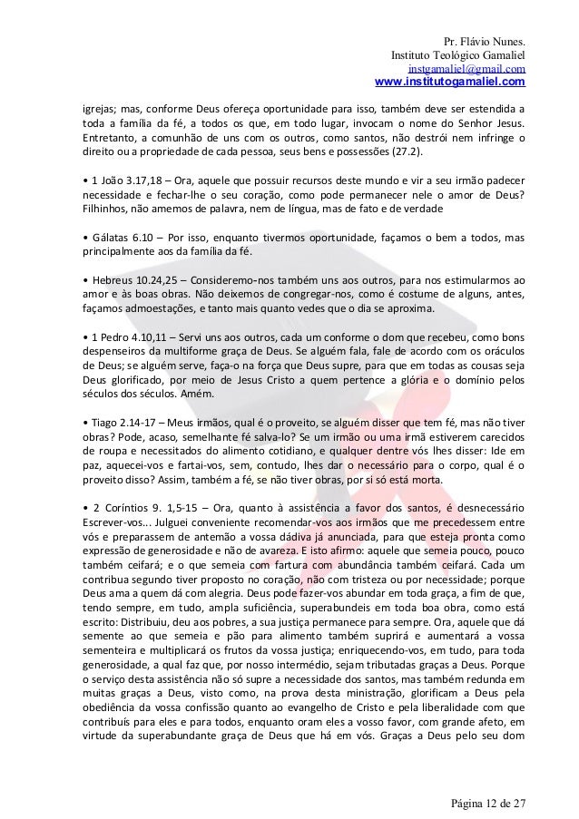 12. 12. Pr. Flávio Nunes. Instituto Teológico Gamaliel instgamaliel@gmail.com www.institutogamaliel.comigrejas; mas, conforme Deus ofereça oportunidade para isso, também deve ser estendida atoda a família da fé, a todos os que, em todo lugar, invocam o nome do Senhor Jesus.Entretanto, a comunhão de uns com os outros, como santos, não destrói nem infringe odireito ou a propriedade de cada pessoa, seus bens e possessões (27.2).• 1 João 3.17,18 – Ora, aquele que possuir recursos deste mundo e vir a seu irmão padecernecessidade e fechar-lhe o seu coração, como pode permanecer nele o amor de Deus?Filhinhos, não amemos de palavra, nem de língua, mas de fato e de verdade• Gálatas 6.10 – Por isso, enquanto tivermos oportunidade, façamos o bem a todos, masprincipalmente aos da família da fé.• Hebreus 10.24,25 – Consideremo‐nos também uns aos outros, para nos estimularmos aoamor e às boas obras. Não deixemos de congregar-nos, como é costume de alguns, antes,façamos admoestações, e tanto mais quanto vedes que o dia se aproxima.• 1 Pedro 4.10,11 – Servi uns aos outros, cada um conforme o dom que recebeu, como bonsdespenseiros da multiforme graça de Deus. Se alguém fala, fale de acordo com os oráculosde Deus; se alguém serve, faça-o na força que Deus supre, para que em todas as cousas sejaDeus glorificado, por meio de Jesus Cristo a quem pertence a glória e o domínio pelosséculos dos séculos. Amém.• Tiago 2.14-17 – Meus irmãos, qual é o proveito, se alguém disser que tem fé, mas não tiverobras? Pode, acaso, semelhante fé salva-lo? Se um irmão ou uma irmã estiverem carecidosde roupa e necessitados do alimento cotidiano, e qualquer dentre vós lhes disser: Ide empaz, aquecei-vos e fartai-vos, sem, contudo, lhes dar o necessário para o corpo, qual é oproveito disso? Assim, também a fé, se não tiver obras, por si só está morta.• 2 Coríntios 9. 1,5-15 – Ora, quanto à assistência a favor dos santos, é desnecessárioEscrever-vos... Julguei conveniente recomendar-vos aos irmãos que me precedessem entrevós e preparassem de antemão a vossa dádiva já anunciada, para que esteja pronta comoexpressão de generosidade e não de avareza. E isto afirmo: aquele que semeia pouco, poucotambém ceifará; e o que semeia com fartura com abundância também ceifará. Cada umcontribua segundo tiver proposto no coração, não com tristeza ou por necessidade; porqueDeus ama a quem dá com alegria. Deus pode fazer-vos abundar em toda graça, a fim de que,tendo sempre, em tudo, ampla suficiência, superabundeis em toda boa obra, como estáescrito: Distribuiu, deu aos pobres, a sua justiça permanece para sempre. Ora, aquele que dásemente ao que semeia e pão para alimento também suprirá e aumentará a vossasementeira e multiplicará os frutos da vossa justiça; enriquecendo-vos, em tudo, para todagenerosidade, a qual faz que, por nosso intermédio, sejam tributadas graças a Deus. Porqueo serviço desta assistência não só supre a necessidade dos santos, mas também redunda emmuitas graças a Deus, visto como, na prova desta ministração, glorificam a Deus pelaobediência da vossa confissão quanto ao evangelho de Cristo e pela liberalidade com quecontribuís para eles e para todos, enquanto oram eles a vosso favor, com grande afeto, emvirtude da superabundante graça de Deus que há em vós. Graças a Deus pelo seu dom Página 12 de 27